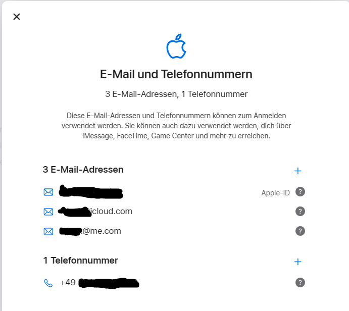 Der im Abschnitt "Eine zusätzliche E-Mail-Adresse löschen" beschriebene Prozess funktioniert bei mir nicht, da ich kein - Zeichen habe, sondern nur ein ?