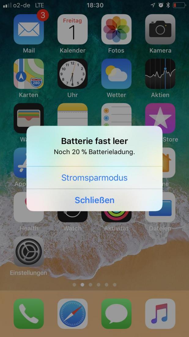 Energiesparmodus Hinweis bei noch 20 Prozent / 10 Prozent