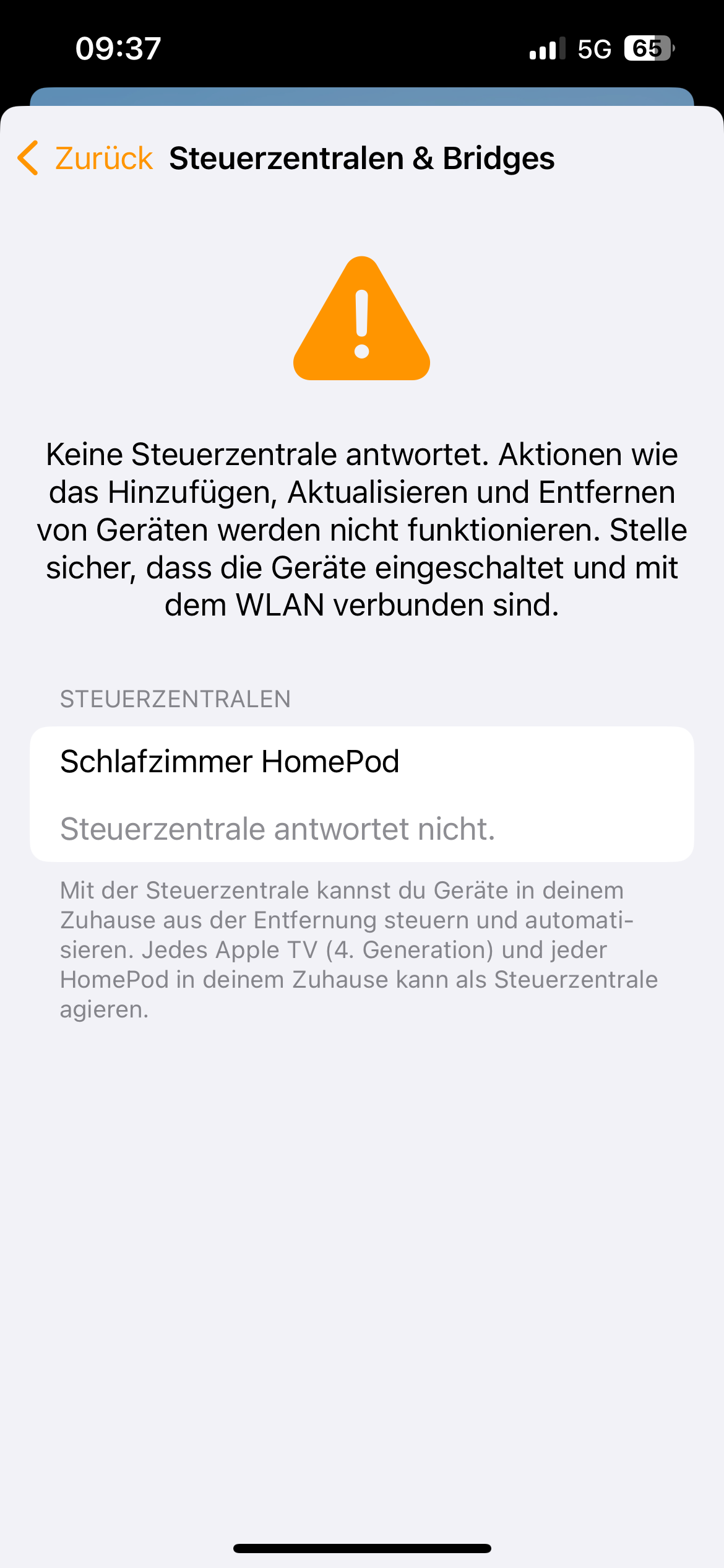 ich bekomme öfter bei meinem Home Pod mini die Fehlermeldung „keine Steuerzentrale antwortet“. Der Home Pod gibt mir bei direkten Drücken nur die Siri Ausgabe „Ich habe ein Problem mit der Internetverbindung. ….“, jedoch hat er laut App vollen Empfang.