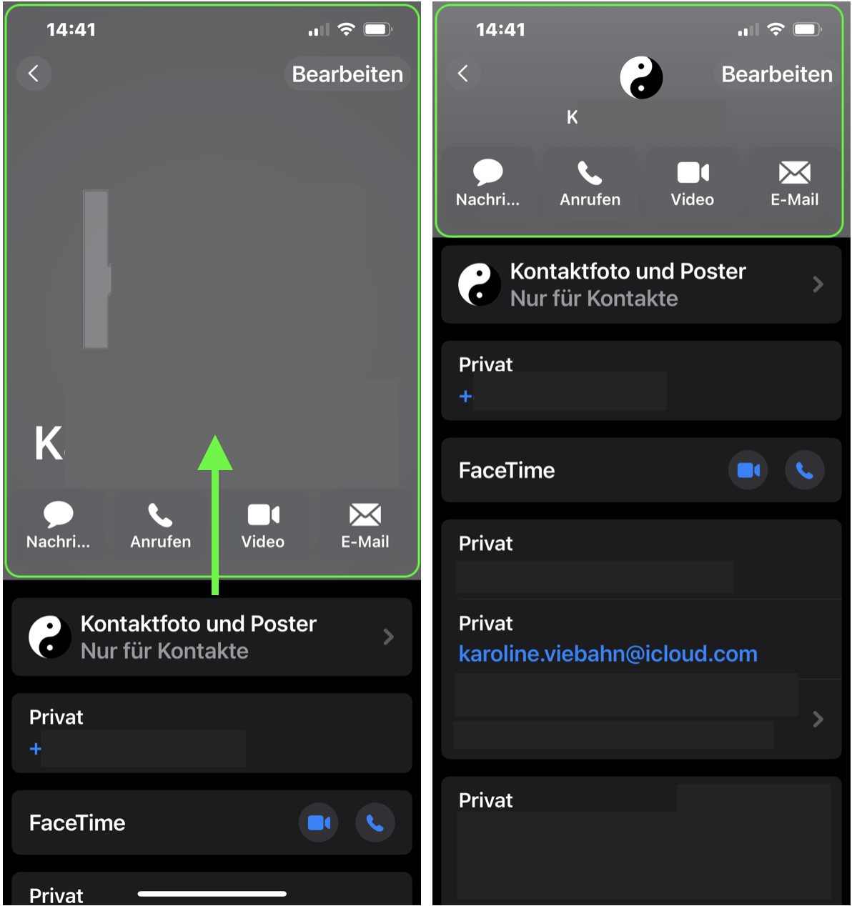 Ab IOS 17 wird bei den Kontakten ein sehr grosser Bereich für das Bild und Name angezeigt. Dadurch sind Tel Nummern und Adresse nicht mehr sichtbar, Man muss dann immer scrollen. Kann ich diesen übergrossen Bereich wieder verkleinern ?