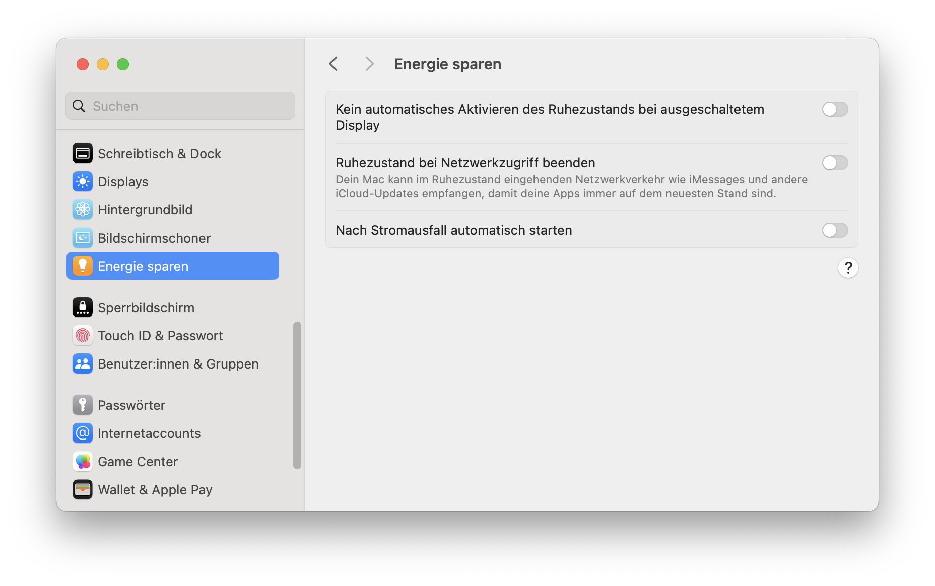trotz der Tatsache, dass ich die angehängten Einstellungen unter Energie sparen deaktiviert habe, ist mein Stromverbrauch beim Mac Studio (M1 Max) im Ruhezustand recht hoch. Ich komme bei einer mehrstündigen Messung mit einer Smarten Steckdose im Mittel auf 10-15W. Das erscheint mir viel zu hoch, denn diese Werte erhalte ich im Leerlauf bzw. bei wenig Last auch des öfteren...