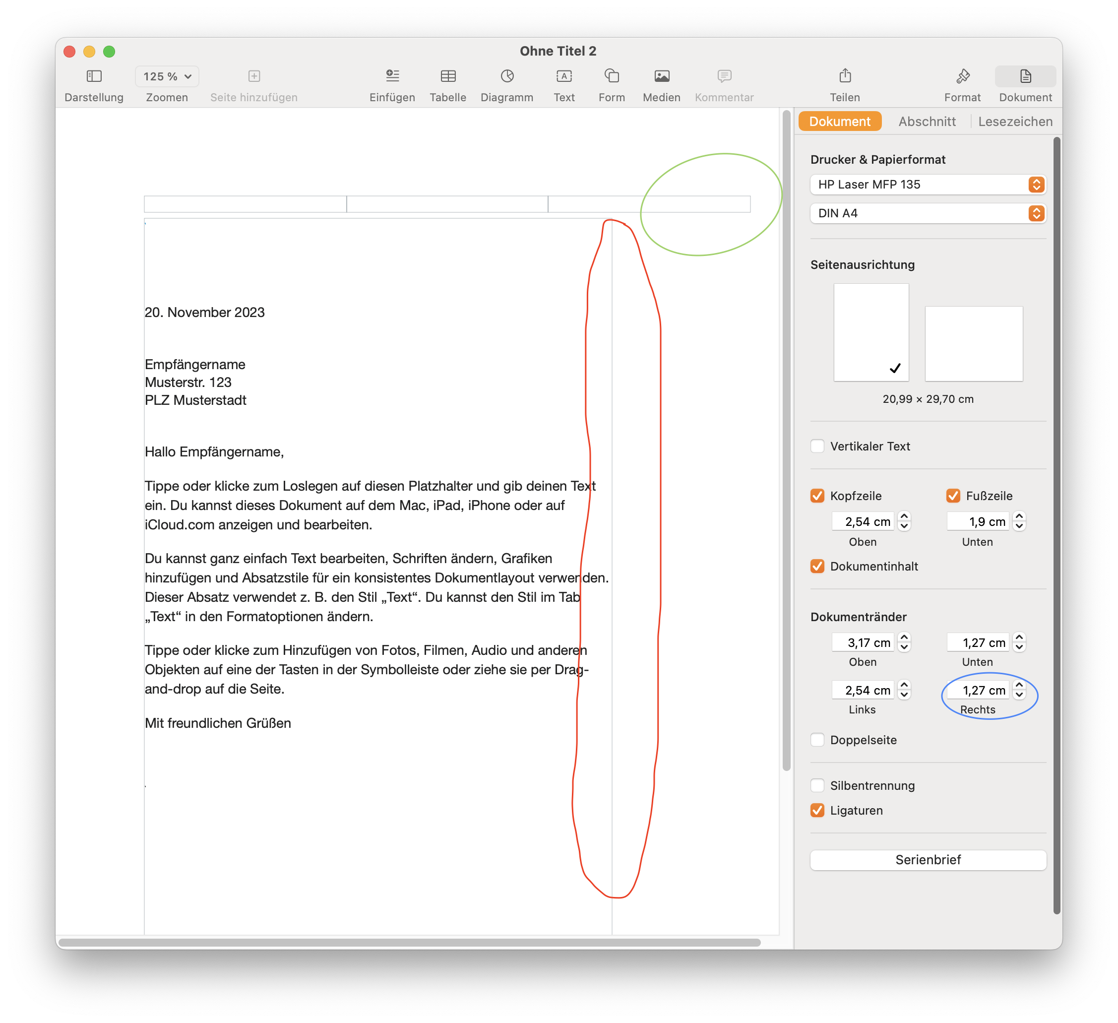 Bitte sehen Sie das angehängte Bild an. Ich möchte die Linie im roten Kreis nach rechts schieben. Aber das geht nicht. Wenn ich den rechten Rand durch das Eingabefeld im blauen Kreis reduziere, geht zwar die Linie im roten Kreis nach rechts, aber der Rand der Kopfzeile (im grünen Kreis) geht auch nach rechts, sogar außerhalb des Papiers. Wie kann ich nur die Linie im roten Kreis nach rechts schieben?