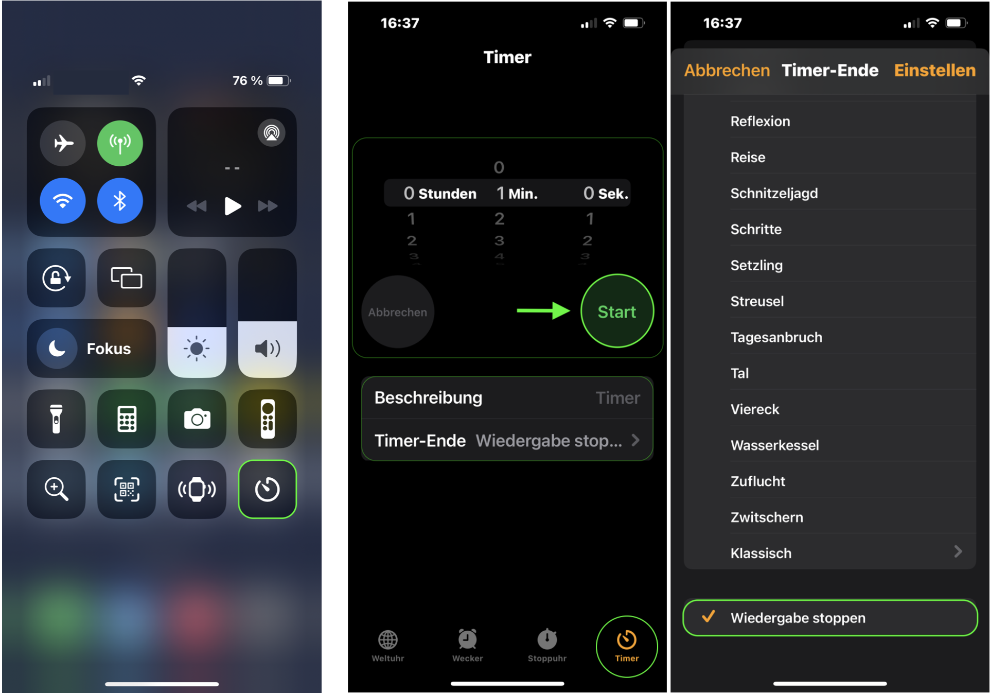 Lege die Zeit fest, wie lange die Musik gespielt werden soll bzw. bis die Wiedergabe gestoppt wird und tippe auf den Startbutton. Um zu vermeiden, dass du nach dem Ablauf des Timers durch einen Klingelton geweckt wirst, wähle ganz unten „Wiedergabe stoppen“.