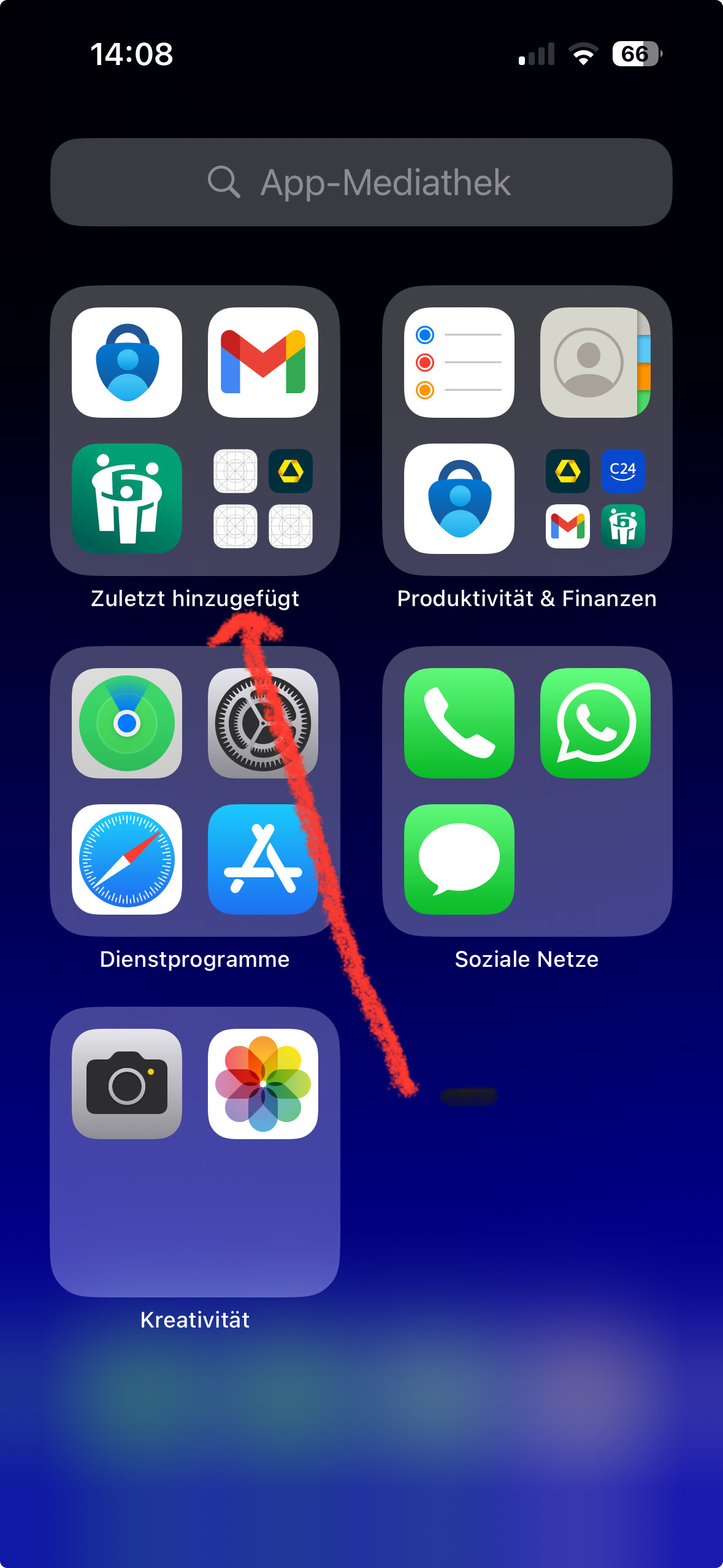 In der App-Mediathek werden einige Symbole nur als Platzhalter angezeigt siehe Screenshot über dem roten Pfeil die 3 Symbole. iPhone 15 Pro, iOS 17.1.1
