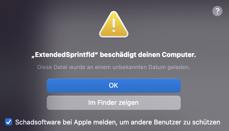 Seit Tagen erscheint immer wieder ein Feld "ExtendedSprintfld" beschädigt deinen Computer. Entfernen, in den Papierkorb legen ist nicht möglich.