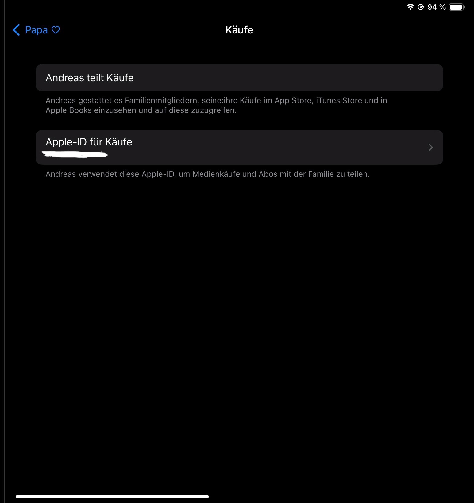 Es wurde überprüft, dass für die Familienfreigabe und für „Medien & Käufe“ dieselbe Apple-ID verwendet wird und die Kauffreigabe aktiviert ist. Auf seinem Gerät lassen sich die Käufe problemlos abspielen.
