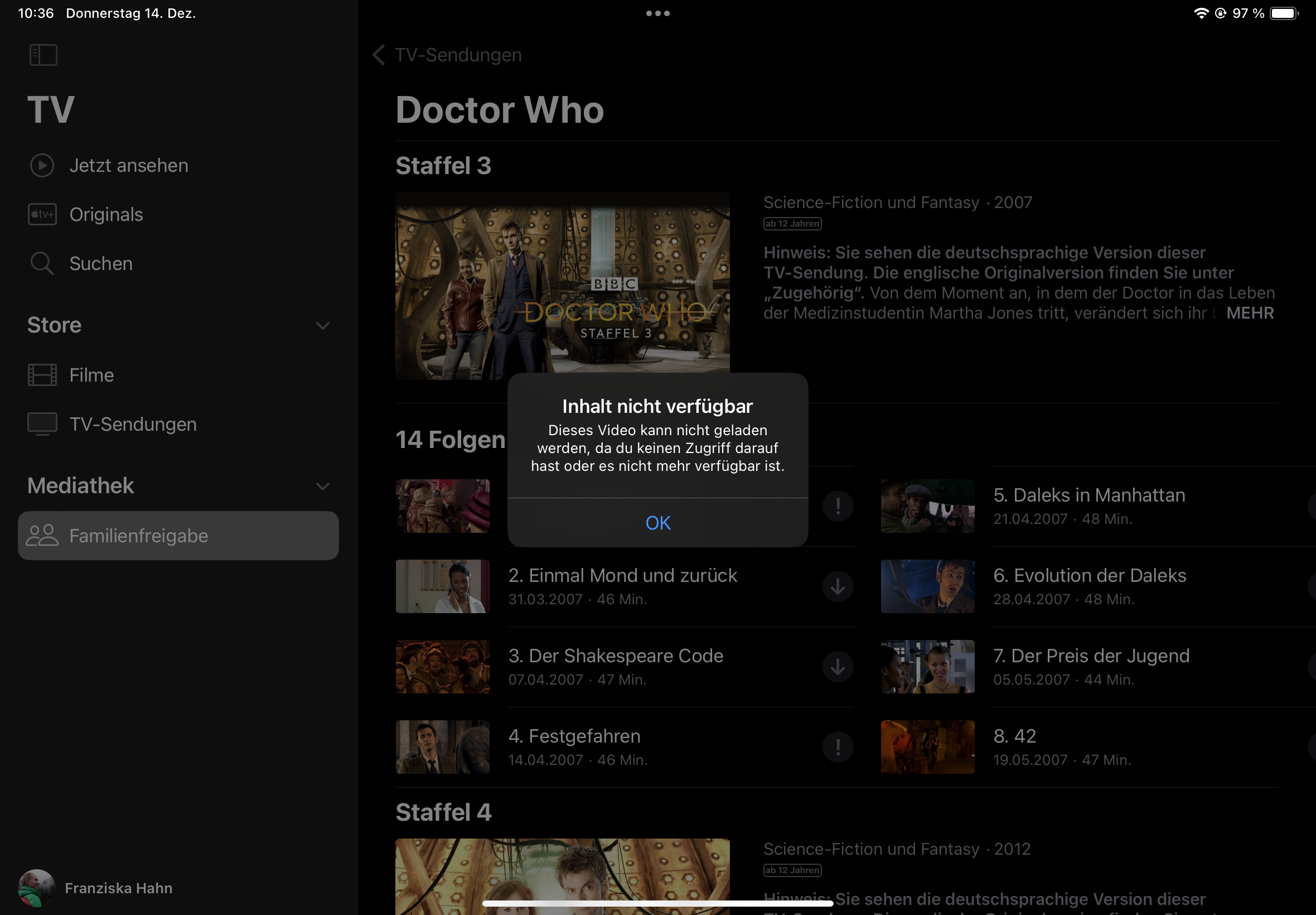 Sobald ich von ihm gekaufte Filme oder Serien in der Apple TV App abspielen möchte, kommt jedes mal die Fehlermeldung: „Inhalt nicht verfügbar, Dieses Video kann nicht geladen werden, da du keinen Zugriff darauf hast oder es nicht mehr verfügbar ist.“