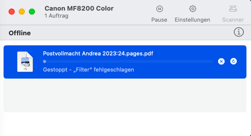 Seit dem update von Mojave auf Monterey druckt er nicht mehr und meldet nur "Gestoppt - Filter fehlgeschlagen".