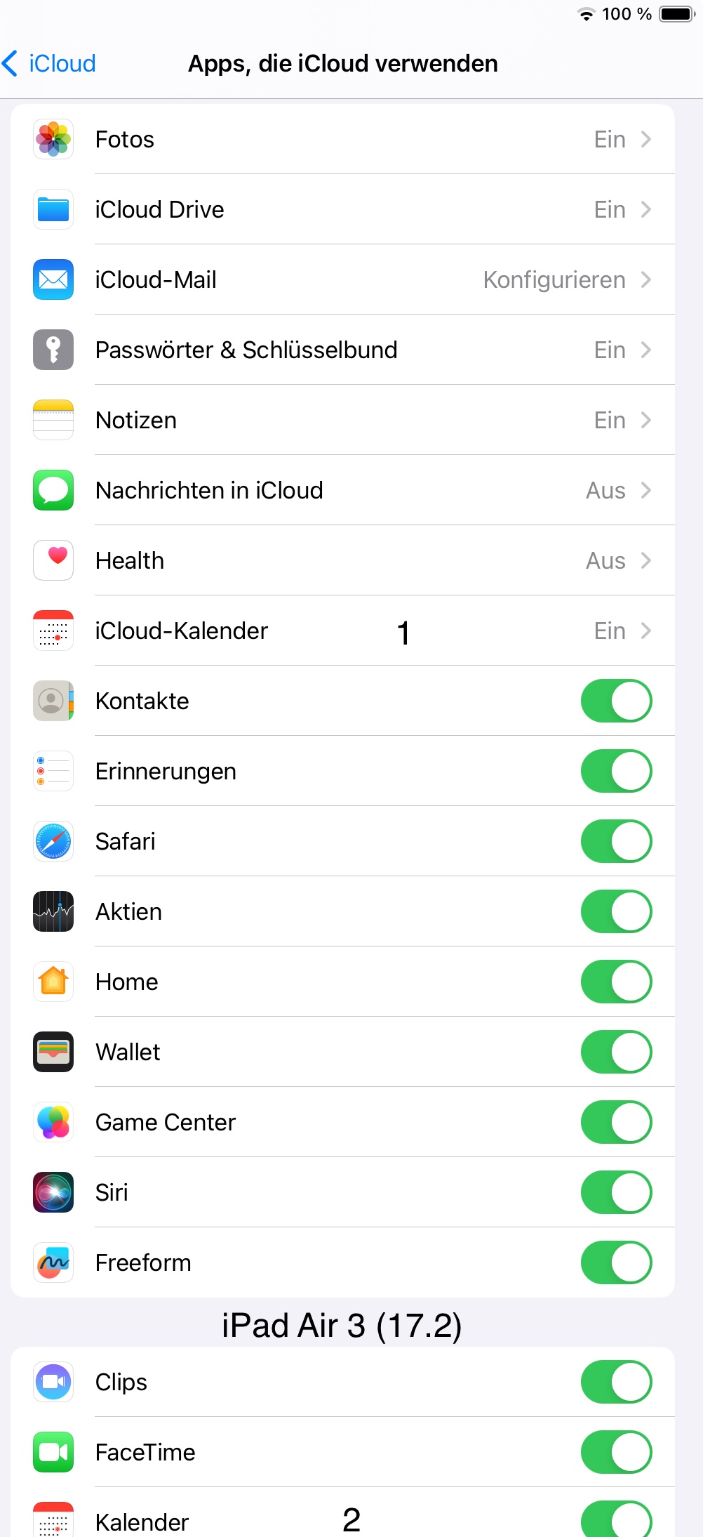 Ok... verstehe... kannst du in der Kalender App auf deinem iPhone aber alle Kalender sehen, sind diese identisch und auf dem gleichen Datenstand wie z.B. auf deinem iPad oder einem anderen Gerät welches mit der selben Apple-ID verbunden ist?