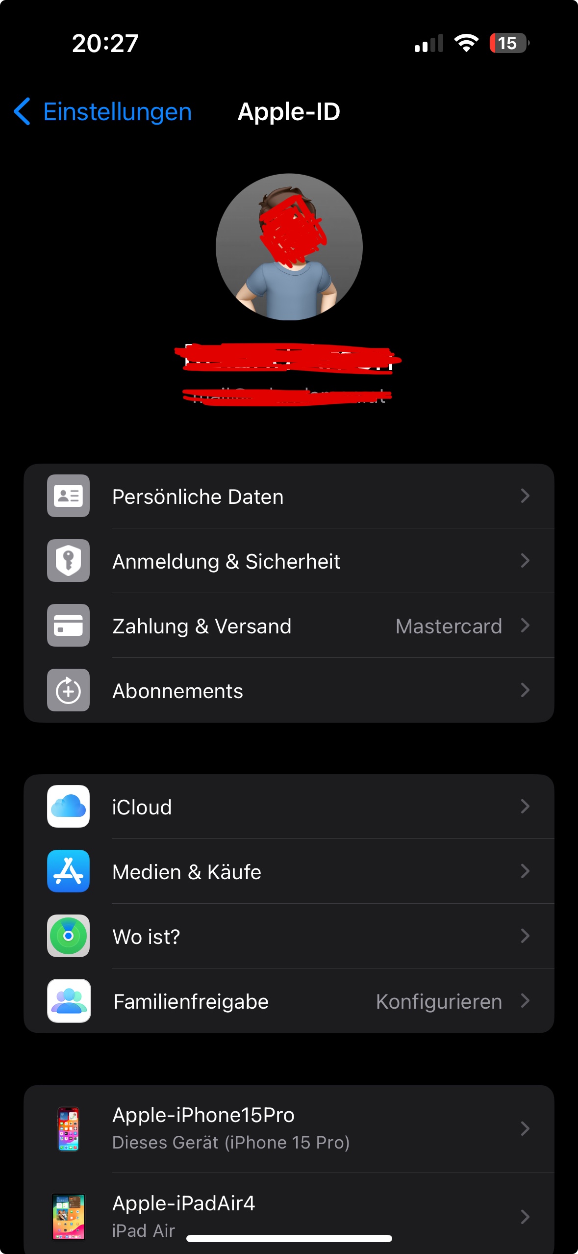 Hi, ich habe genau das gleiche Problem. Auf dem iPad wird die Apple-ID angezeigt, auf dem iPhone 15 nicht. Wäre mir prinzipiell egal, leider bekomme ich aufs Phone nur keine Bestätigungsmails von Apple mehr. Hast du mittlerweile eine Lösung gefunden?