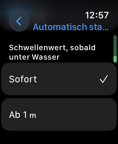 In den Einstellungen auf der Apple Watch Ultra 2 für "Automatisch starten" läßt sich der Wasserschutz automatisch ab einer bestimmten Tiefe aktivieren. Wählt man dort "Sofort" dann wirkt dies ab 10cm.