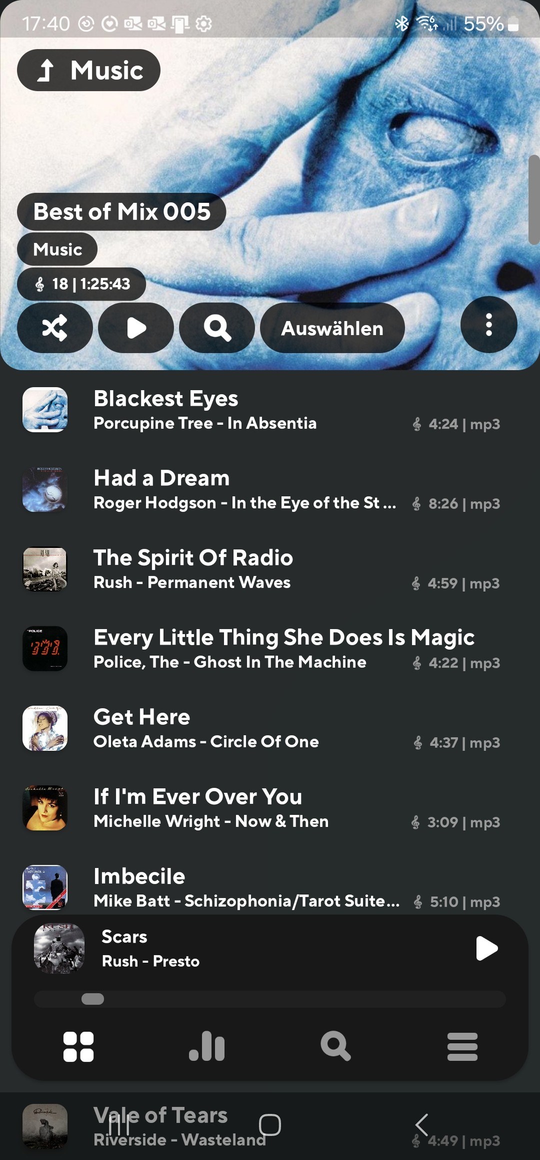 Ich füge mal zwei Bilder von Android ein, da habe ich Poweramp, erstes Bild zeigt eben die Ordner-Hierachie da habe ich eben Ordner mit gemischten Titeln (quasi wie eine Playlist, nur eben als tatsächliche Dateien in Ordnern abgelegt) und dann eben der Klick auf den Ordner und die Tiel erscheineen und ich kann einen Tiel wählen, der wird abgespielt und dann der nächste im Ordner.