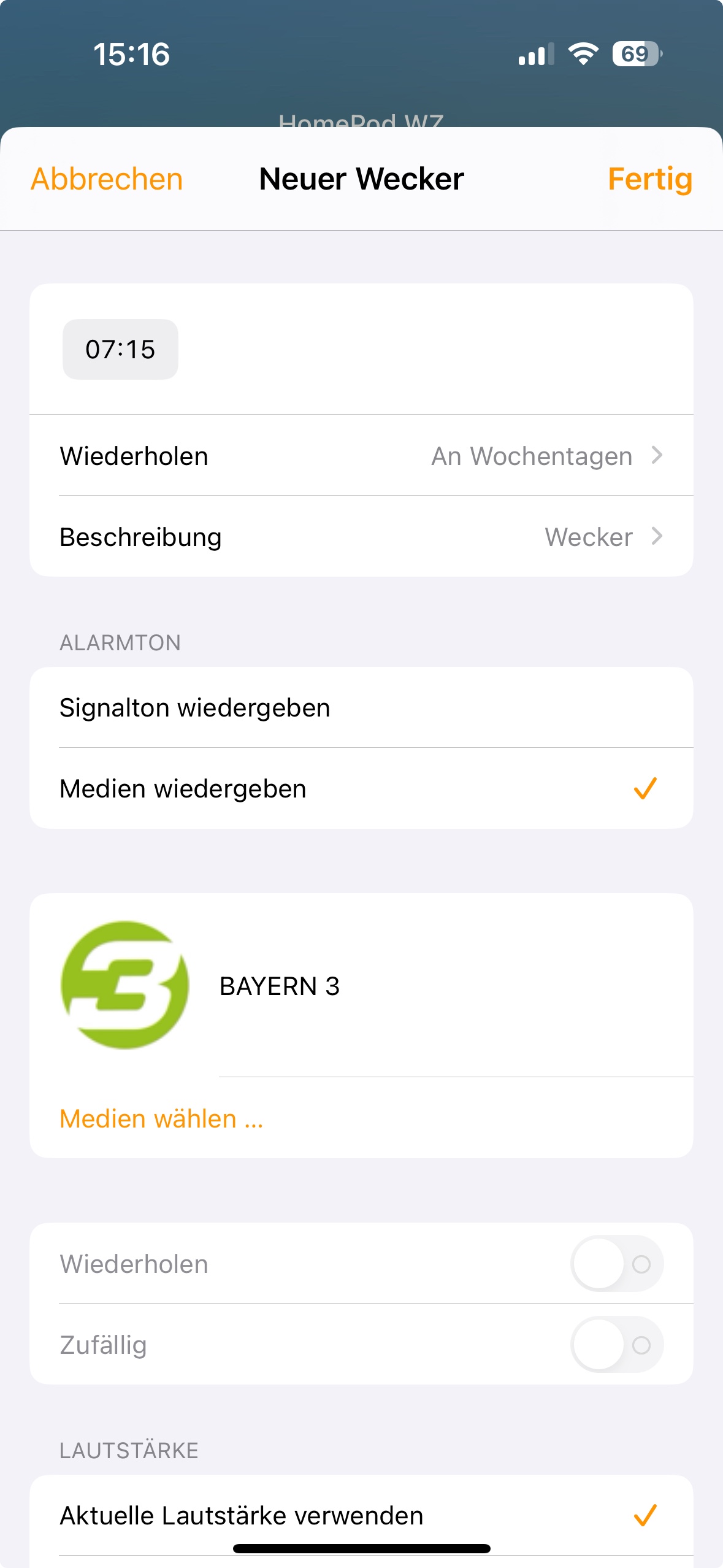 Wenn der Wecker ausgelöst wird, wird der Radiosender auf deinem HomePod mini abgespielt. Stelle sicher, dass der HomePod mini zum Zeitpunkt des Wecktons eingeschaltet und mit demselben WLAN-Netzwerk verbunden ist wie dein iPhone.