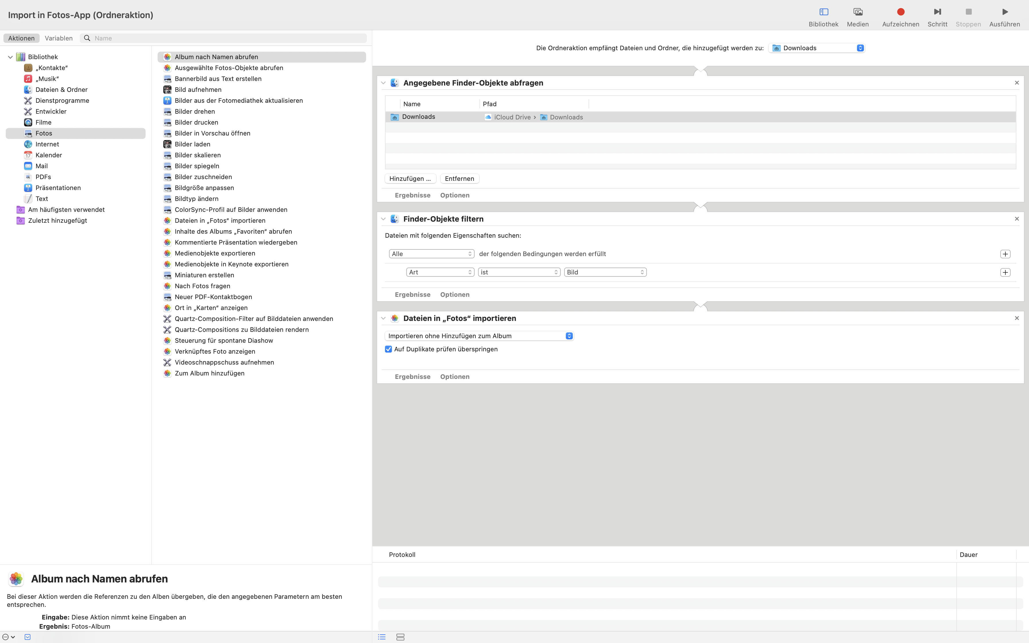 Ich wollte mit meinem Scanner alte Familienfotos einscannen. Sobald ich diese eingescannt habe, werden die automatisch in meinem Download-Ordner gespeichert. Jetzt möchte ich diese aber auch in der Fotos-App haben, weshalb ich über den guten alten Automator eine Ordner-Aktion erstellt habe, welche wie folgt aufgebaut ist: