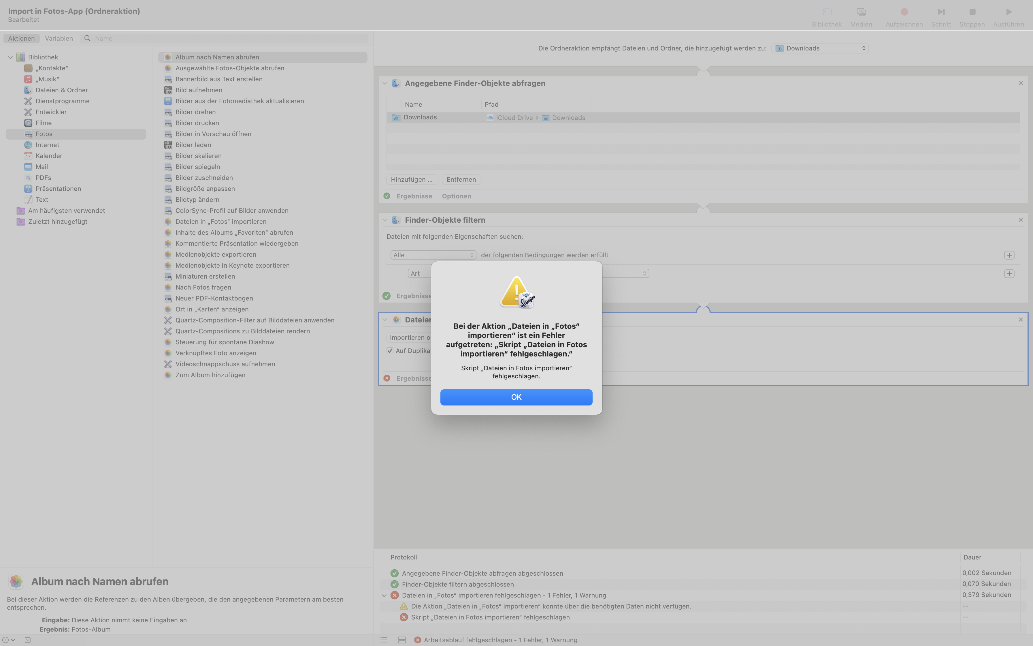 Bei der Aktion „Dateien in „Fotos“ importieren“ ist ein Fehler aufgetreten: „Skript „Dateien in Fotos importieren“ fehlgeschlagen.“ Skript „Dateien in Fotos importieren“ fehlgeschlagen.