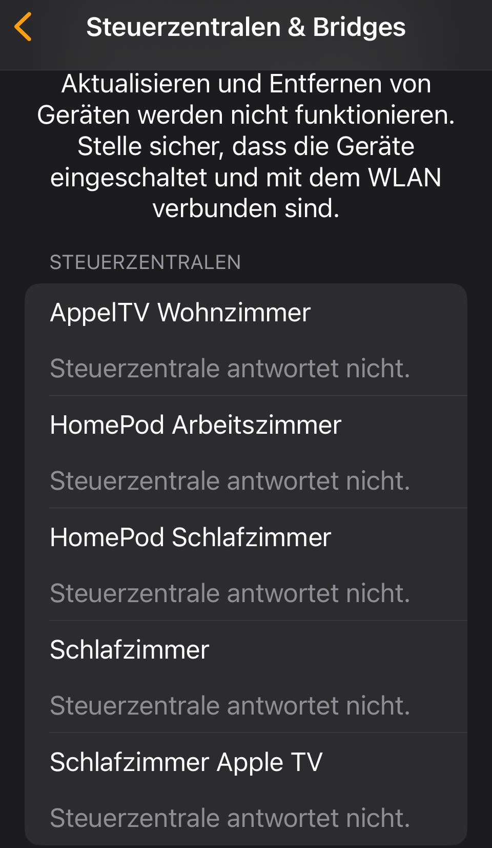 Ich habe seit 2 Tagen das Problem das auf mal keine Steuerzentrale antwortet. Alles ist auf dem aktuellen Stand. z.B. Appel TV der neuesten gen. läuft und hat auch Wlan aber siehe Bild.
