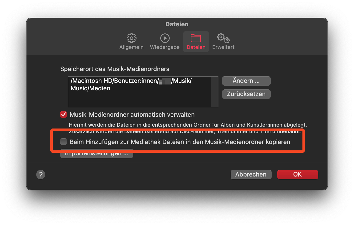 Wenn du die bereits erwähnte Einstellung korrekt vornimmst, dann kannst du alle Titel erneut importieren, deine Musik-Bibliothek wird neu aufgebaut, aber deine Medien verbleiben an ihrem ursprünglichen Speicherplatz: