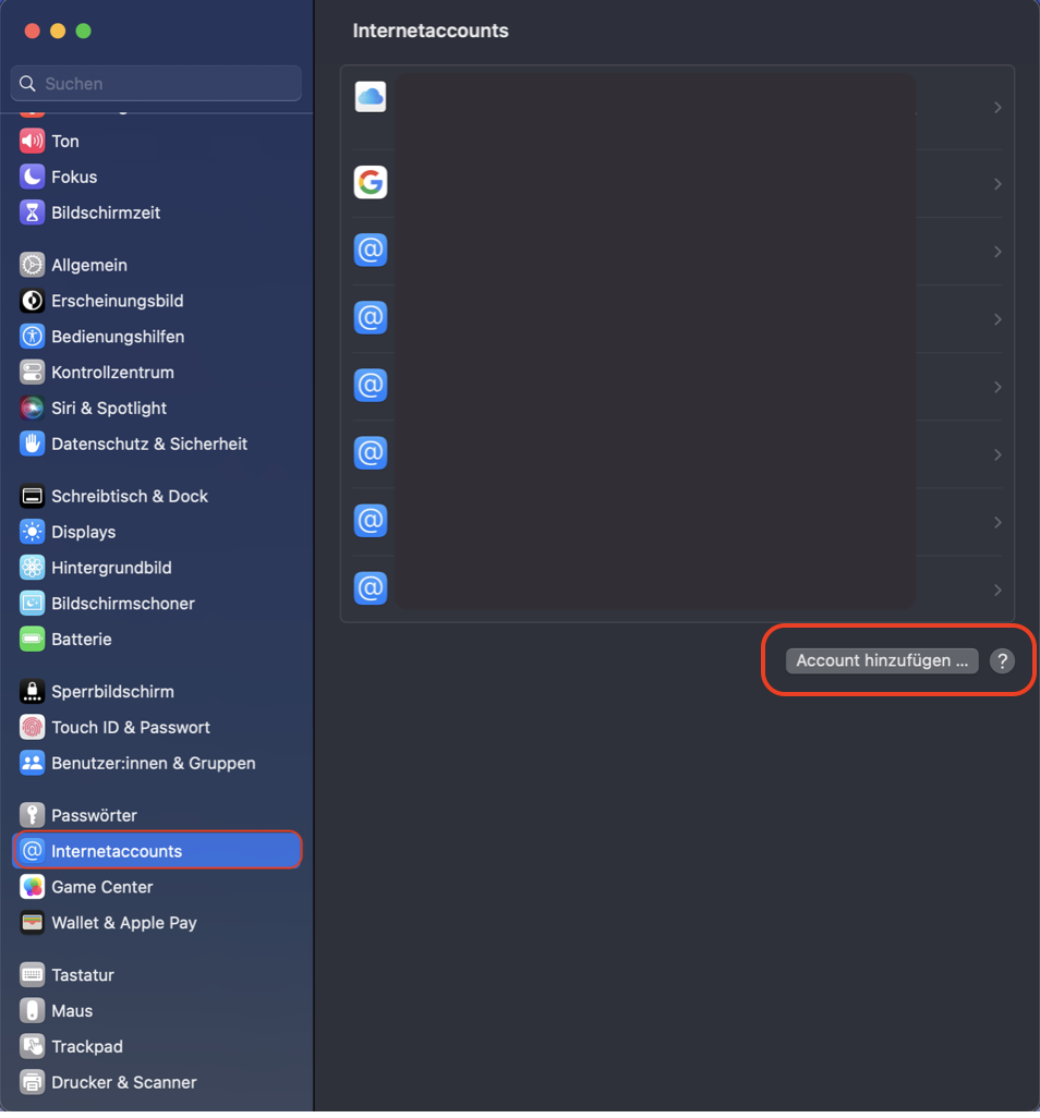 und wähle auf der Seitenleiste "Internetaccounts" aus.