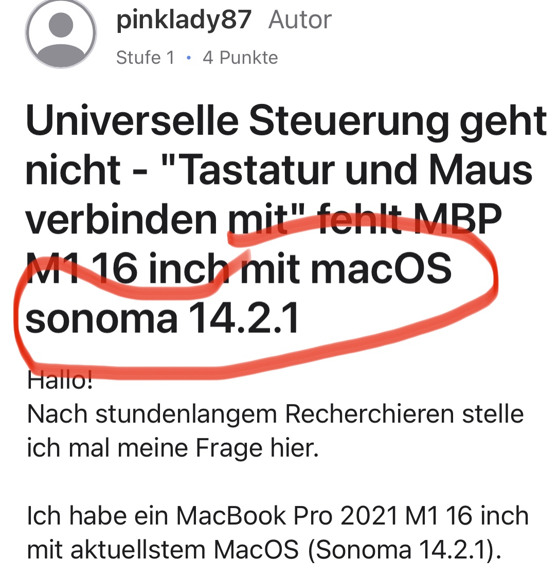 Ich habe ein MacBook Pro 2021 M1 16 inch mit aktuellstem MacOS (Sonoma 14.2.1).