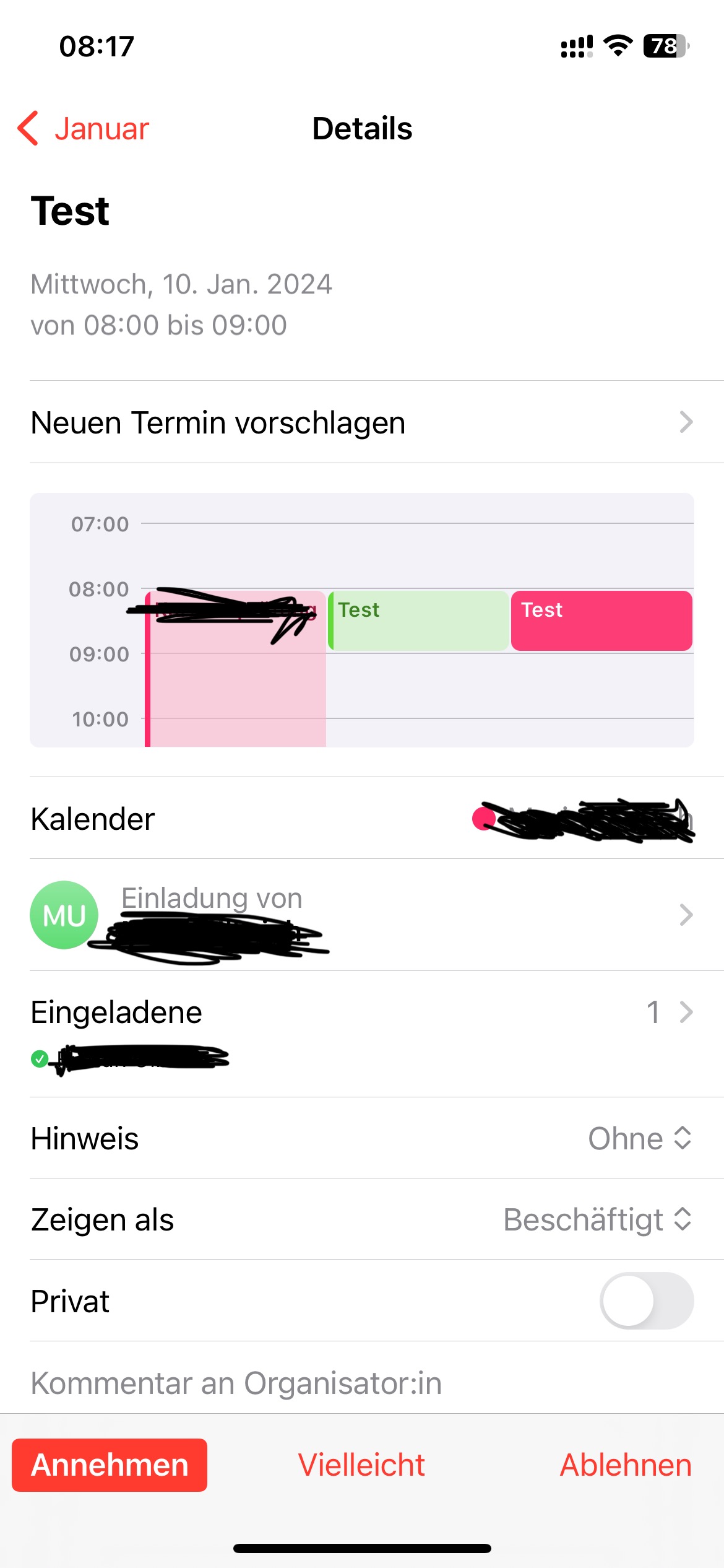 5 Personen mit Office365 haben jeder einen Outlookkalender und geben diesen gegenseitig frei (lesen und bearbeiten). In Outlook (Desktop-App und im Browser) funktioniert dies einwandfrei. An den iPhones wurden die Kalender in der Apple-Kalender-App angezeigt und bis ca. September 2023 funktionierte auch hier alles korrekt, d.h. Entsprechend der in Outlook vergebenen Rechte konnten die freigegebenen Kalender der anderen Personen eingesehen und bearbeitet werden. Seither funktioniert dies nicht mehr. Die Termine in freigegebenen Kalendern werden als Termine, zu denen man selbst eingeladen ist, angezeigt. Eine Bearbeitung von Terminen in den freigegeben Kalendern ist nicht mehr möglich.