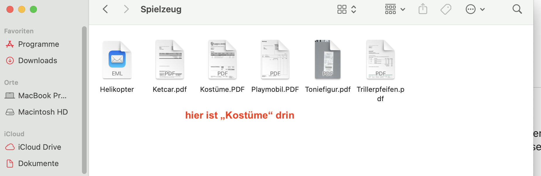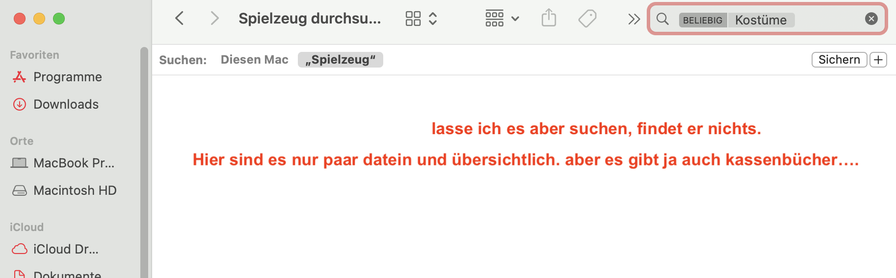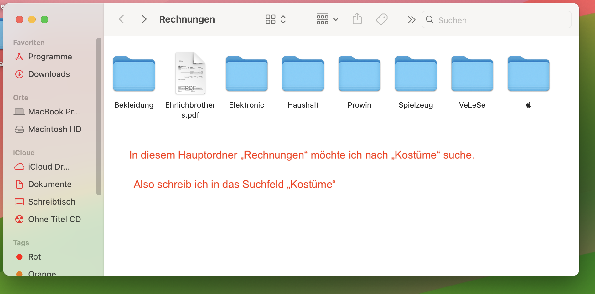 Ich habe mal versucht meine Suche in Fotos zu dokumentieren. Hier den dem Fall suche ich nach "Kostüme" in dem Ordner "Rechnungen"