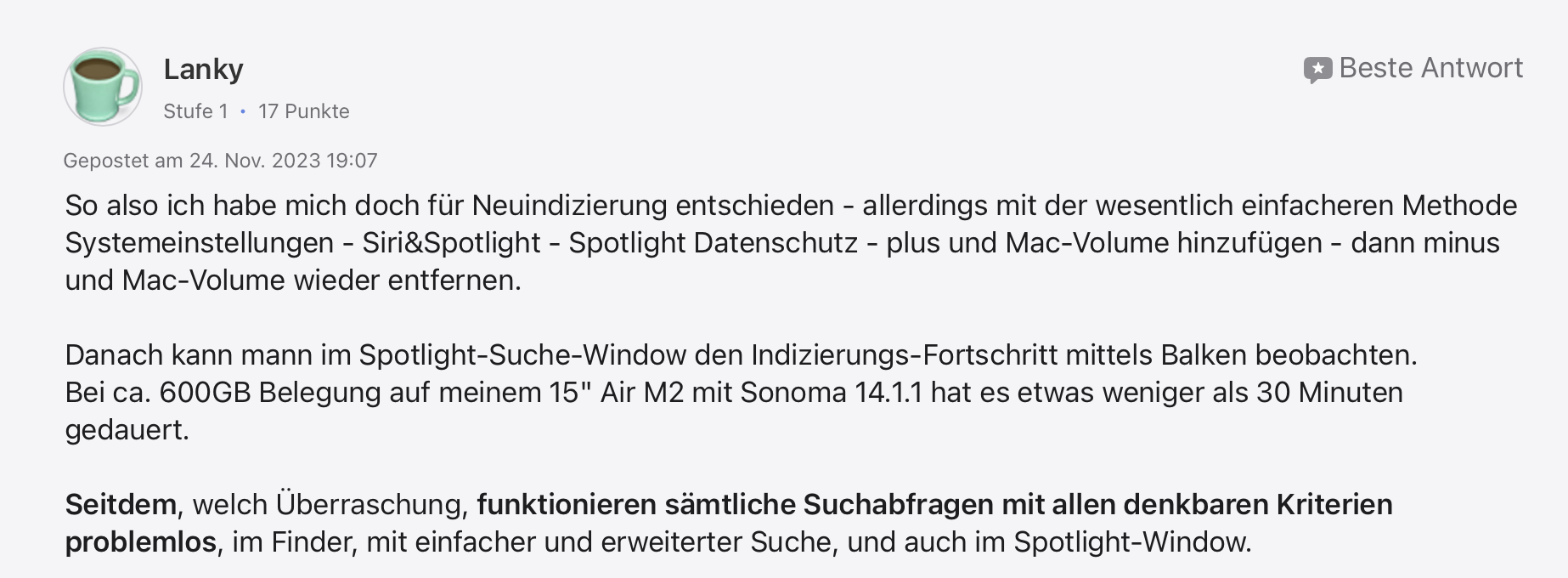 Hallo zusammen. Ich verzweifle langsam. Ich möchte eine bestimmte Datei auf dem Mac suchen. Ich weiß auch in welchem Hauptordner auf dem Schreibtisch die Datei sein muss. Wenn ich dann im Suchfeld den Namen eingebe wird zwar der Mac durchsucht und die Ergebnisse angezeigt, aber ich kann nicht im Unterordner suchen. Früher ging das. Das war sehr Praktisch wenn ich im Kassenbuch eine bestimmte Ausgabe gesucht hatte, aber den Monat nicht mehr wusste. Da brauchte ich im Unterordner z.B 2022 nur nach zB "Tanken" suchen und alle Ergebnisse in "2022" wurden angezeigt. Nun werden mir nur alle Ergebnisse auf dem Mac angezeigt. Also zB auch von 2020, 2021 usw.