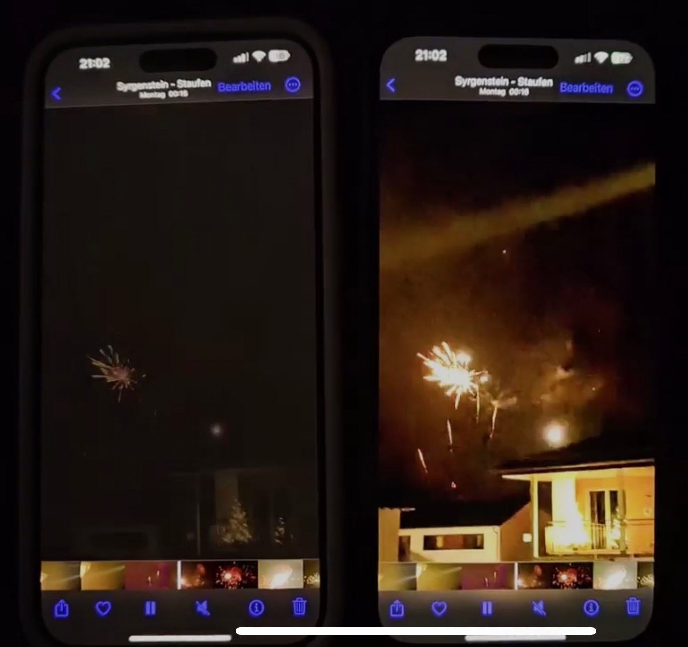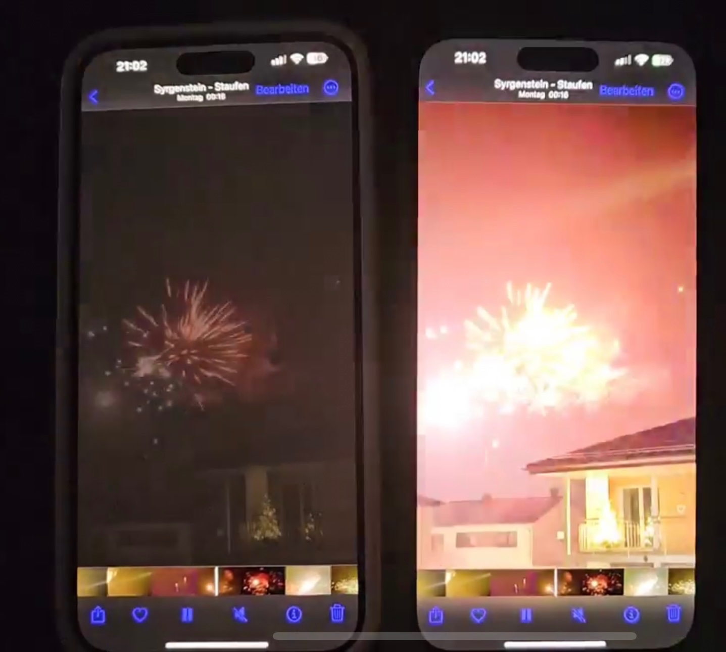 Hierbei ist mir aufgefallen, dass wenn ich die Videos in der Fotos App anschaue, bei den hellen Szenen vom Feuerwerk der Bildschirm stark abgedunkelt wird, als würde das iPhone versuchen die Helligkeit anzupassen. Zudem kommt wie ein grauer Filter über das Video.