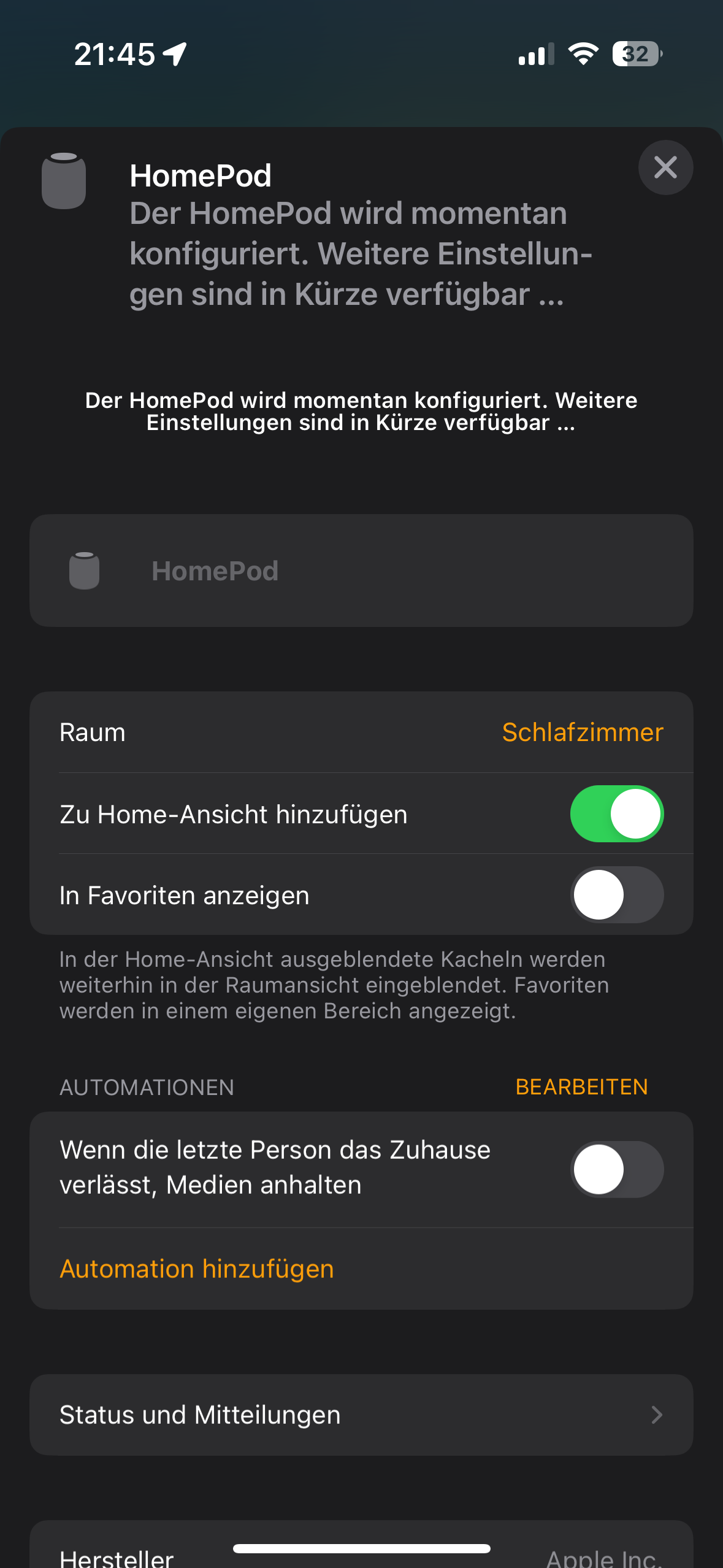 Nachdem ich ihn gekoppelt habe, sagt die Home-App mir, es würde sich demnächst aktualisieren. Seit mehr als 2 Tagen steckt er „in Konfiguration“ fest.