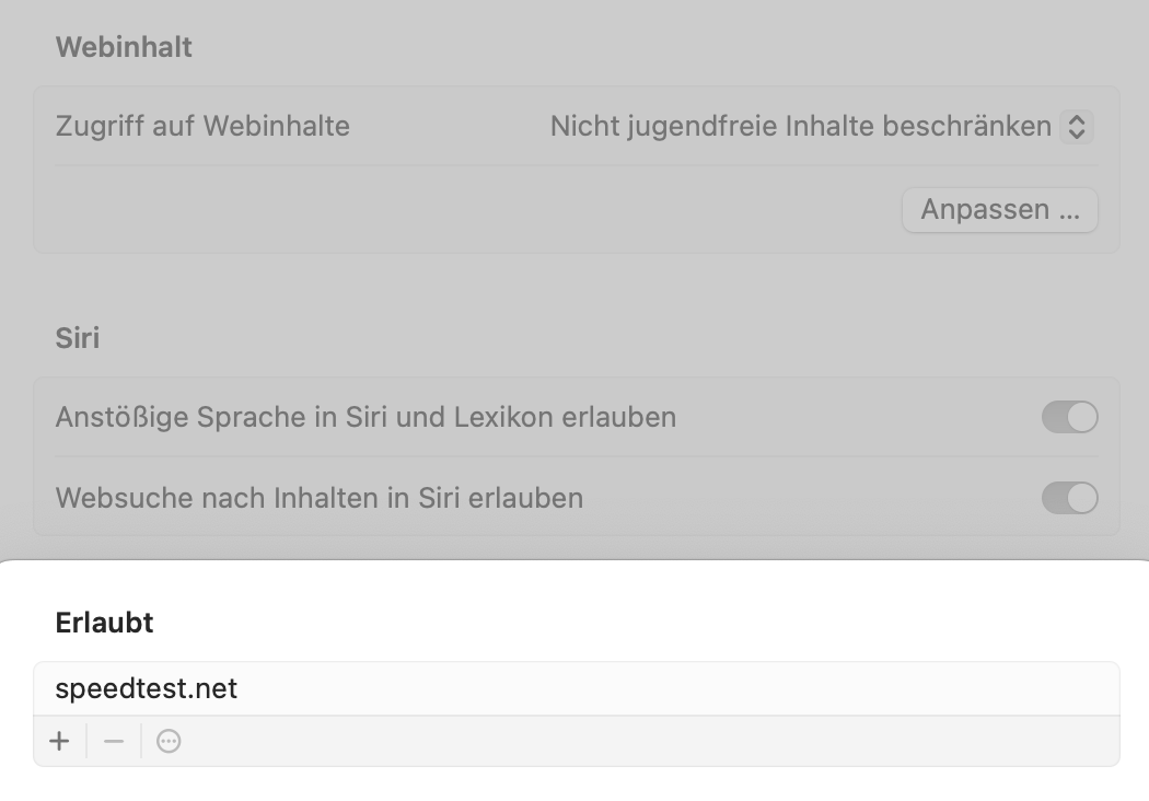 In den Bildschirmzeit-Einstellungen kannst du "Nur bestimmte Websites erlauben" aktivieren und dann die Speedtest-Website (https://www.speedtest.net/) zu den erlaubten Websites hinzufügen. Dadurch wird sichergestellt, dass die Website zugänglich ist.