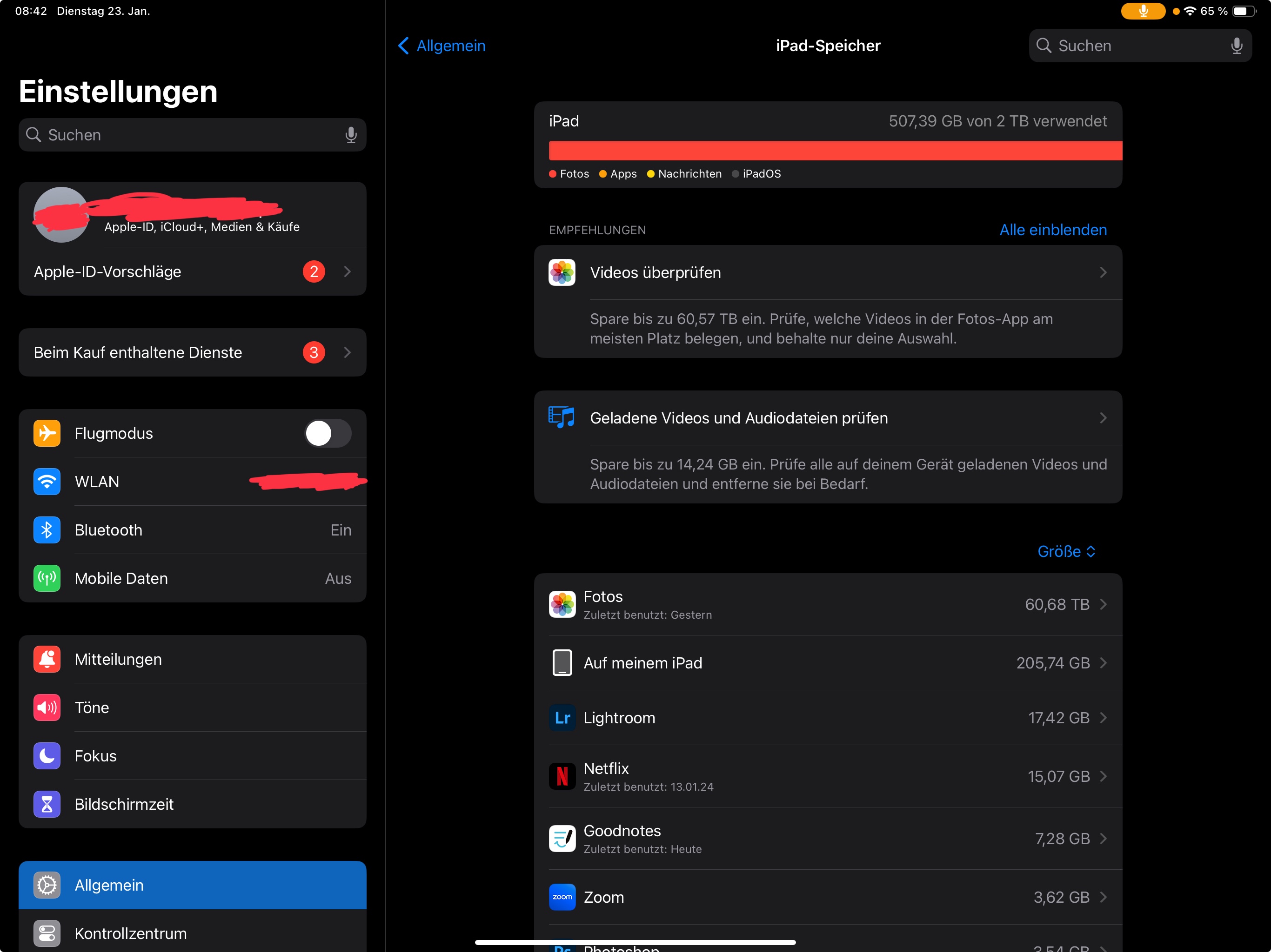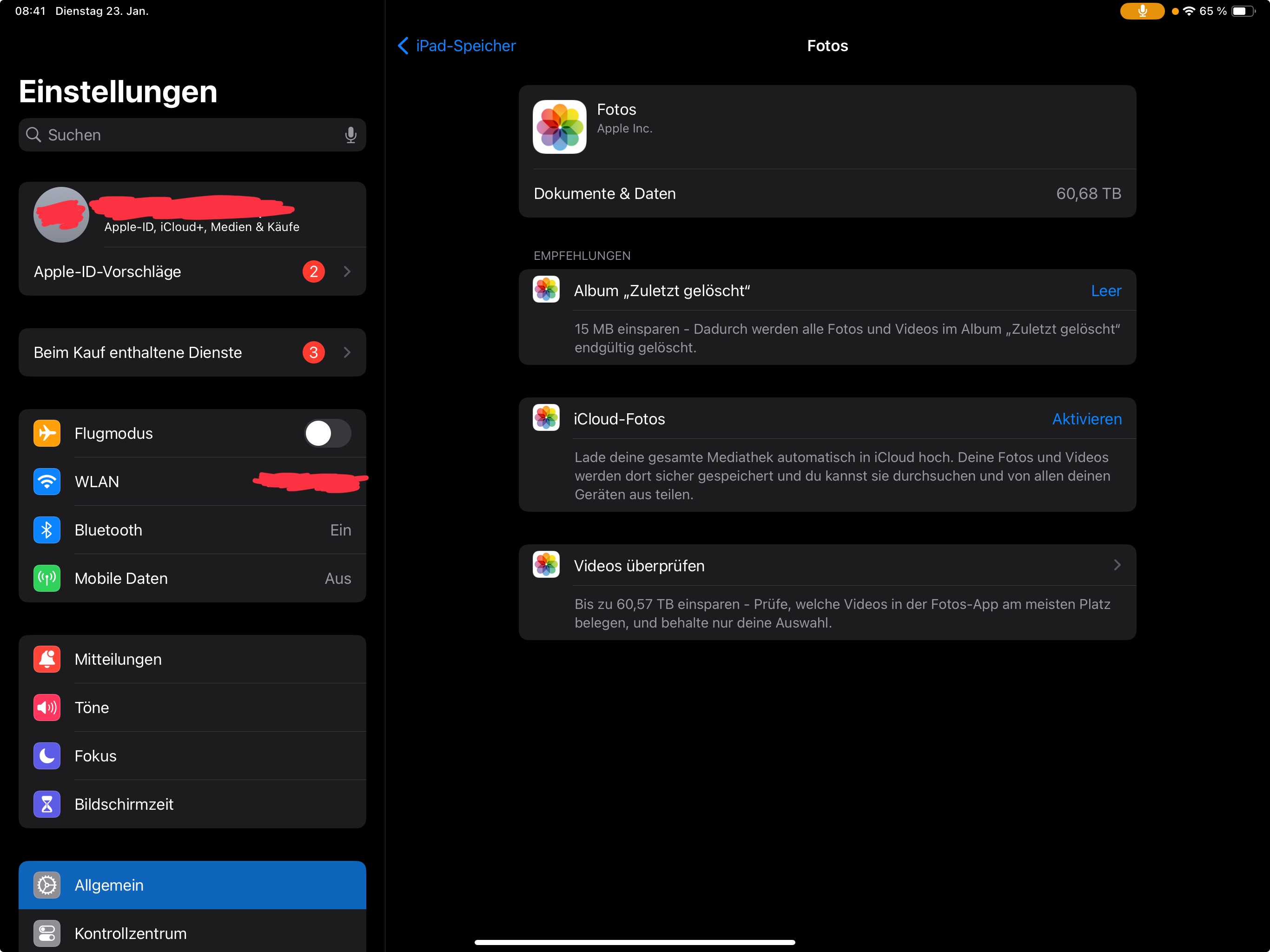 Gehe zu "Einstellungen" > "Allgemein" > "iPad-Speicher". Hier siehst du, wie der Speicherplatz aufgeteilt ist. Überprüfe, ob die einzelnen Kategorien sinnvoll angezeigt werden.