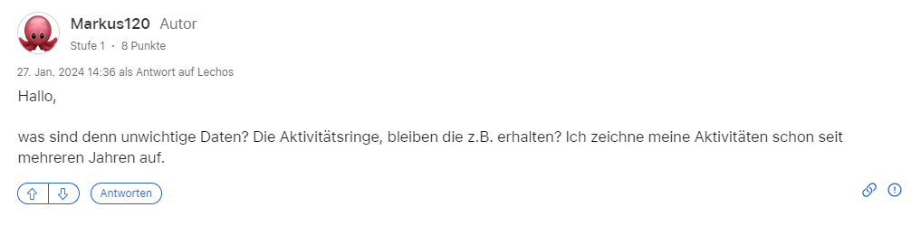 Vielen Dank für die schnelle Rückmeldung! Ich würde gerne nochmal kurz auf das Thema Aktivitätsdaten eingehen, da ich festgestellt habe, dass bei mir Aktivitätsdaten nicht mehr zu sehen die schon älter sind als 1 Jahr. Die Ringe sind dann einfach leer. Aufzeichnen tue ich meine Schritte aber eigentlich schon von Anfang an, seit meinem ersten iPhone was ich 2015 als Geschenk erhalten habe.