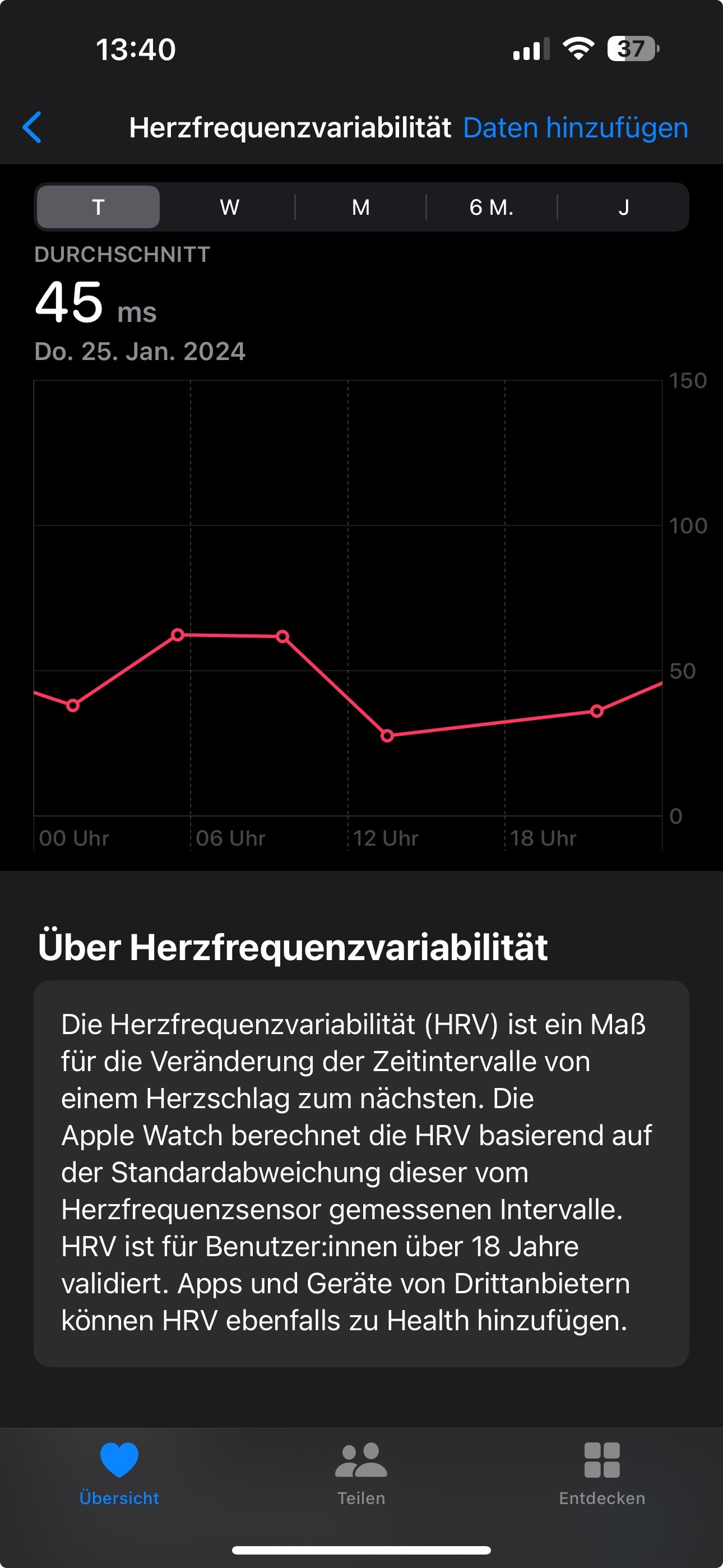 Was möchte ich erreichen? Ich möchte, dass meine Apple Watch wieder jede 20-30 Minuten eine Messung meiner HRV durchführt. Ich füge zwei Screenshots zum Vergleich an! Seit dem 25. sieht es jeden Tag so aus!