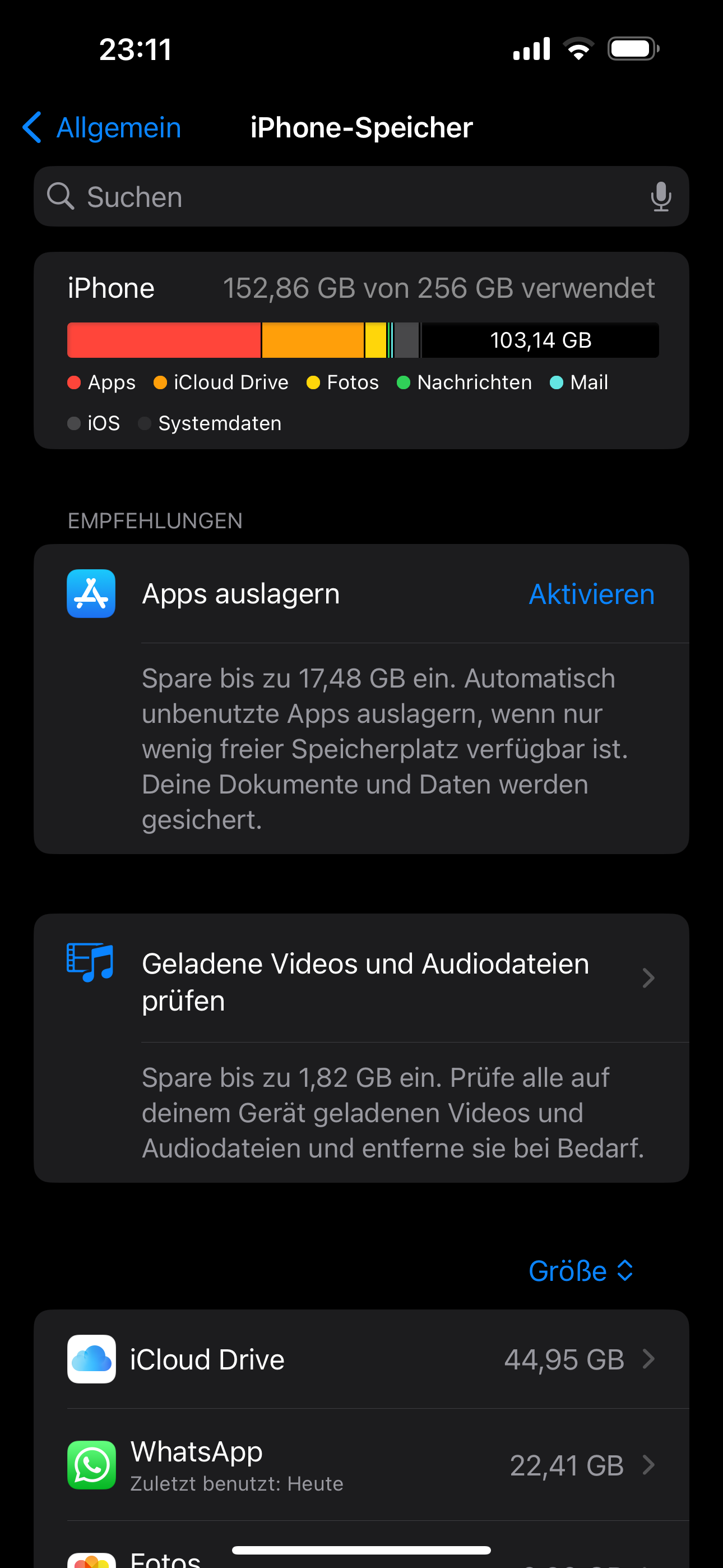 Aber!!! Auf meinem iPhone 14 Pro Max mit 256GB werden 112GB interner Speicher belegt! Das versteht kein Mensch… Nach der Synchronisation mit dem Mac wird es zwar weniger, aber sind immer noch über 40 GB. Leider sind es nach zwei Tagen wieder über 100GB. Weiß jemand woran das liegen könnte??Vielen lieben Dank im Voraus…