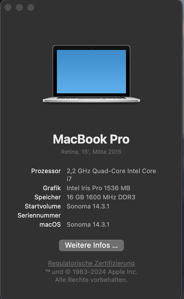 Auf meinem MB Pro11,4 aus 2015 läuft gepatchtes Sonoma 14.3.1 tadellos, und sogar auf meinem uralten 2008er MacPro3,1 laufen die gepatchten MacOS Mojave und Sonoma 14.3.1 ohne jegliche Probleme...
