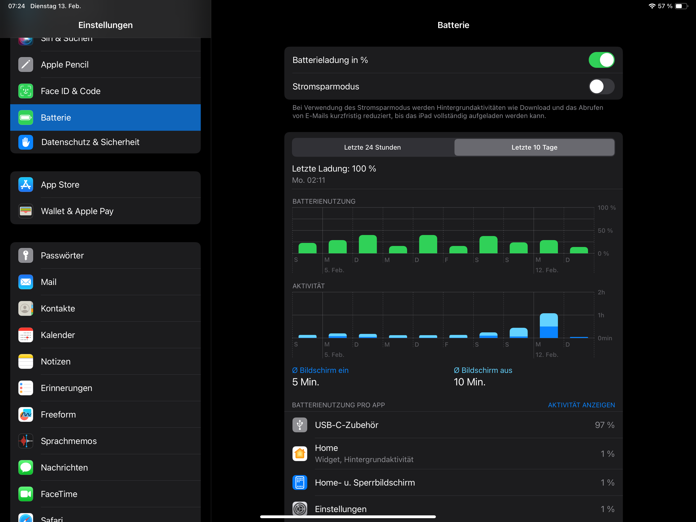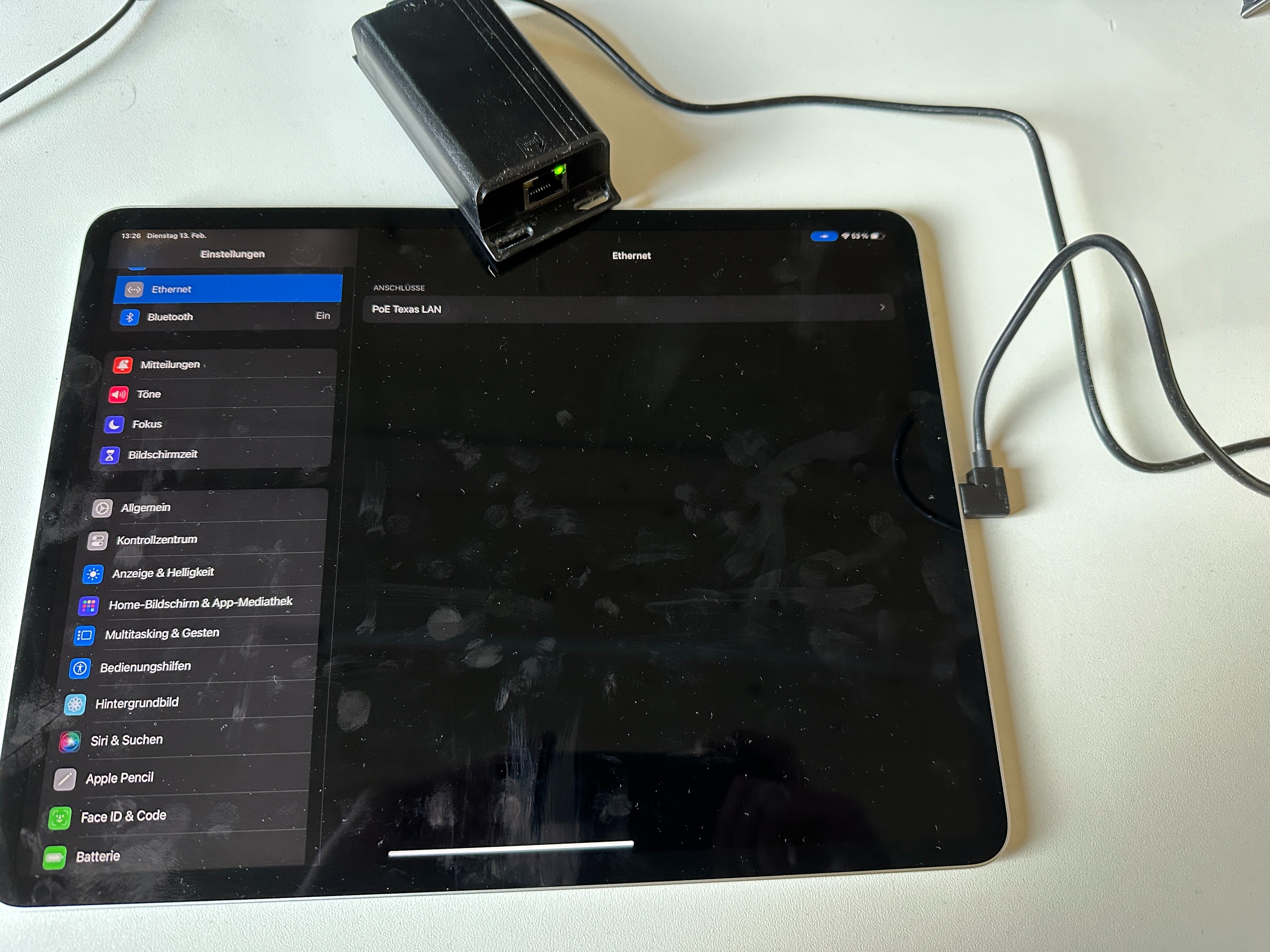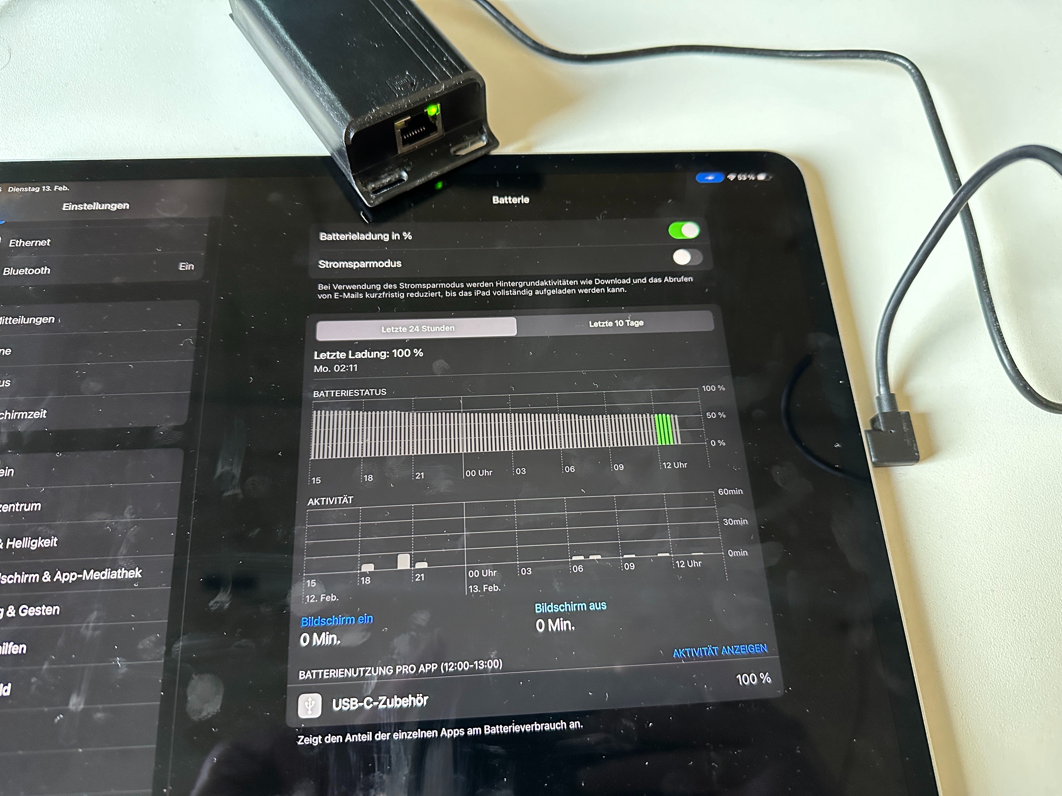 Nun zu meinem Problem. Der Akku des iPads hält lediglich ca. 48h, obwohl der Bildschirm 99% der Zeit aus ist. Fast der komplette Anteil der Batterienutzung entfällt dabei auf USB-C Zubehör (es ist lediglich der PoE USB-C Adapter angeschlossen):