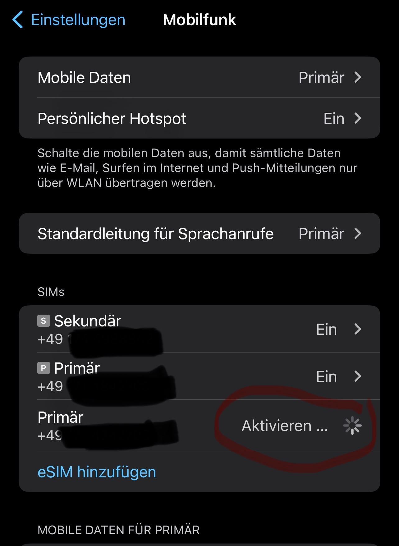 Es ist ärgerlich, dass das "Aktivieren..."-Symbol trotz erfolgreicher Aktivierung der eSIM mit dem QR-Code weiterhin angezeigt wird. Hier sind einige Schritte, die du ausprobieren kannst, um das Problem zu beheben: