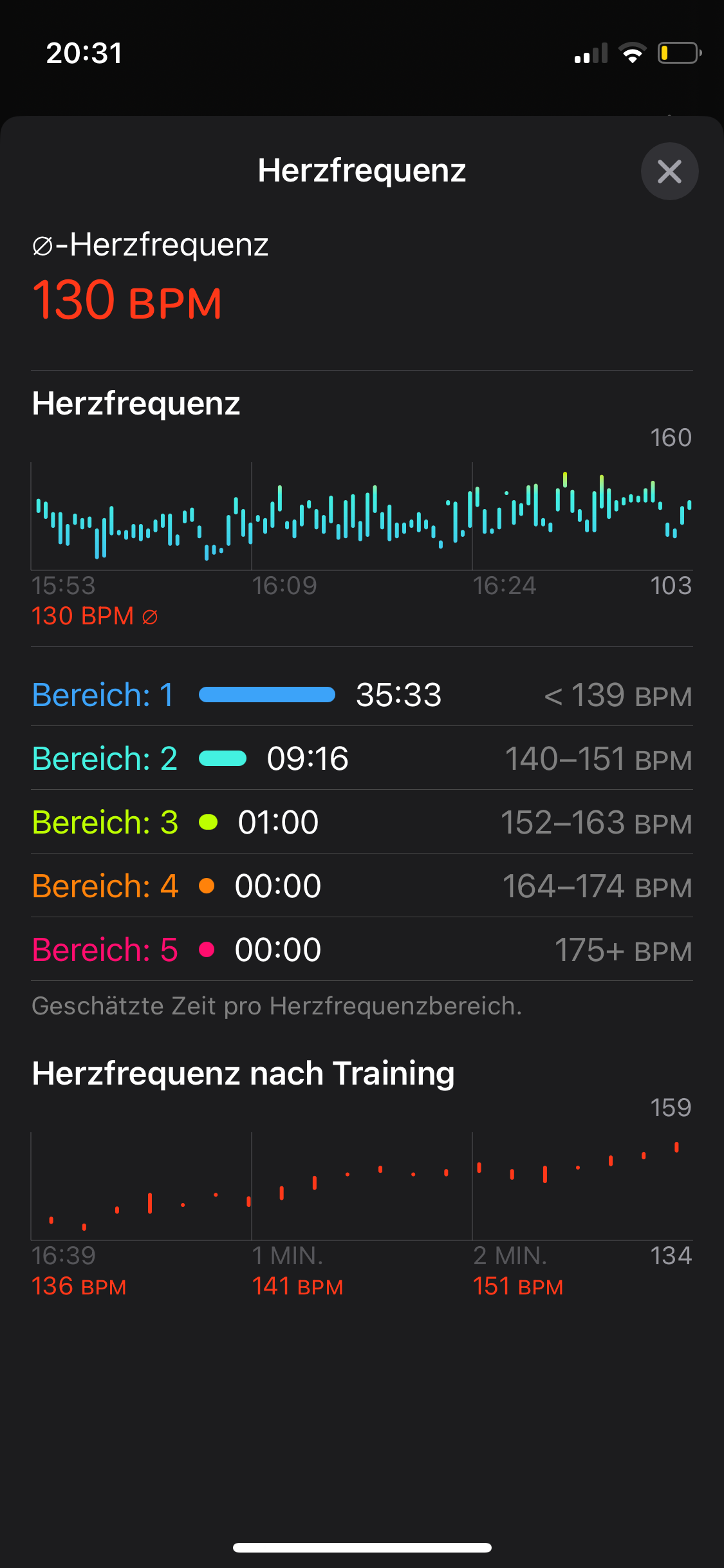 Laut Apple-Watch bin ich bei unter 139 BPM noch in Zone ein. 139 von 191 sind allerdings 72 %. Damit wäre ich schon in Zone 3 und nicht in Zone 1 ( 50-60% der MaxHF). Das verwirrt mich grad extrem. Mein Alter ist richtig bei Health eingeben und mit der Watch gekoppelt.