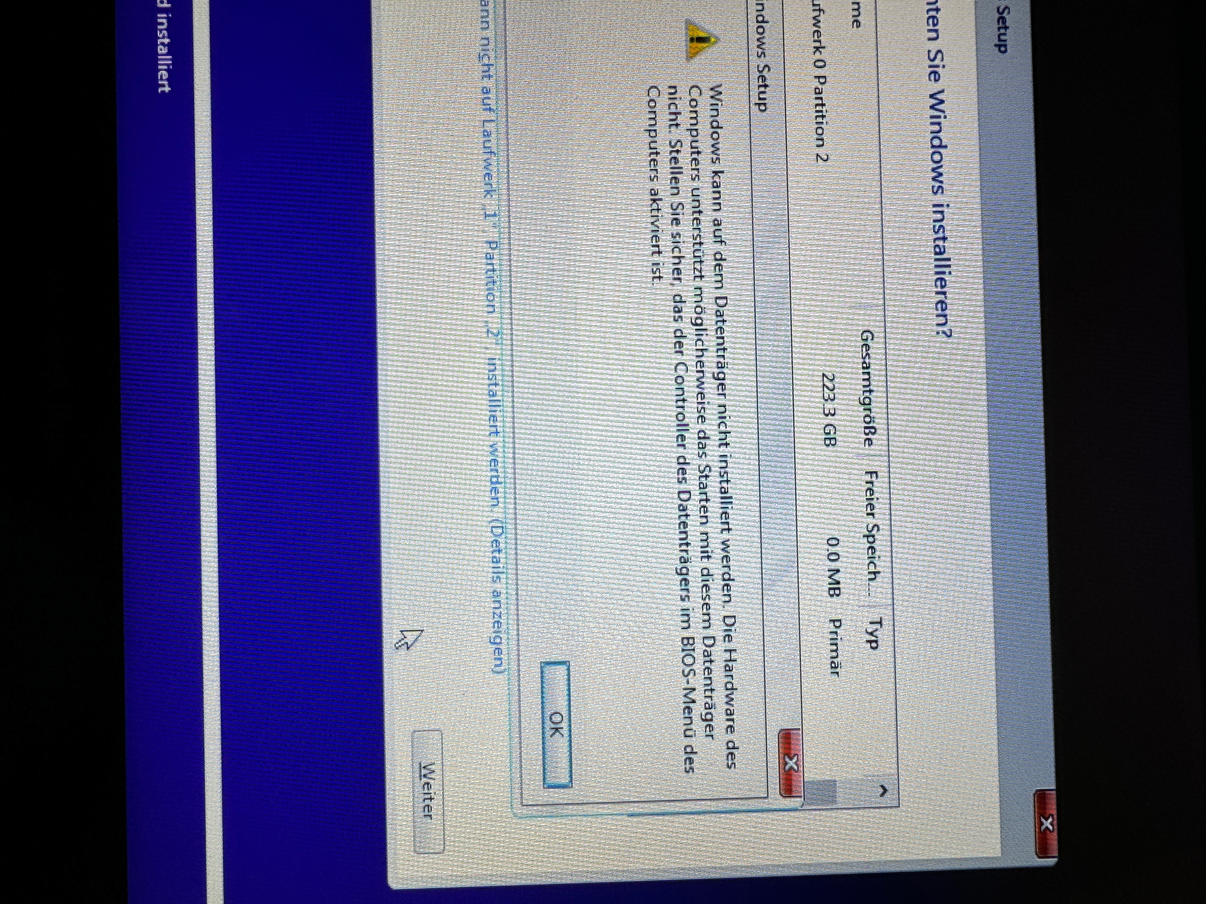 ich habe eine ISO Datei beziehungsweise ein Abbild. Ich hoffe ich erkläre es richtig auf eine USB Stick erstellt doch weiter wie bis zu dieser Fehlermeldung komme ich nicht und ich kann auch die Bootcamp Partition nicht auswählen um dort Windows zu installieren.