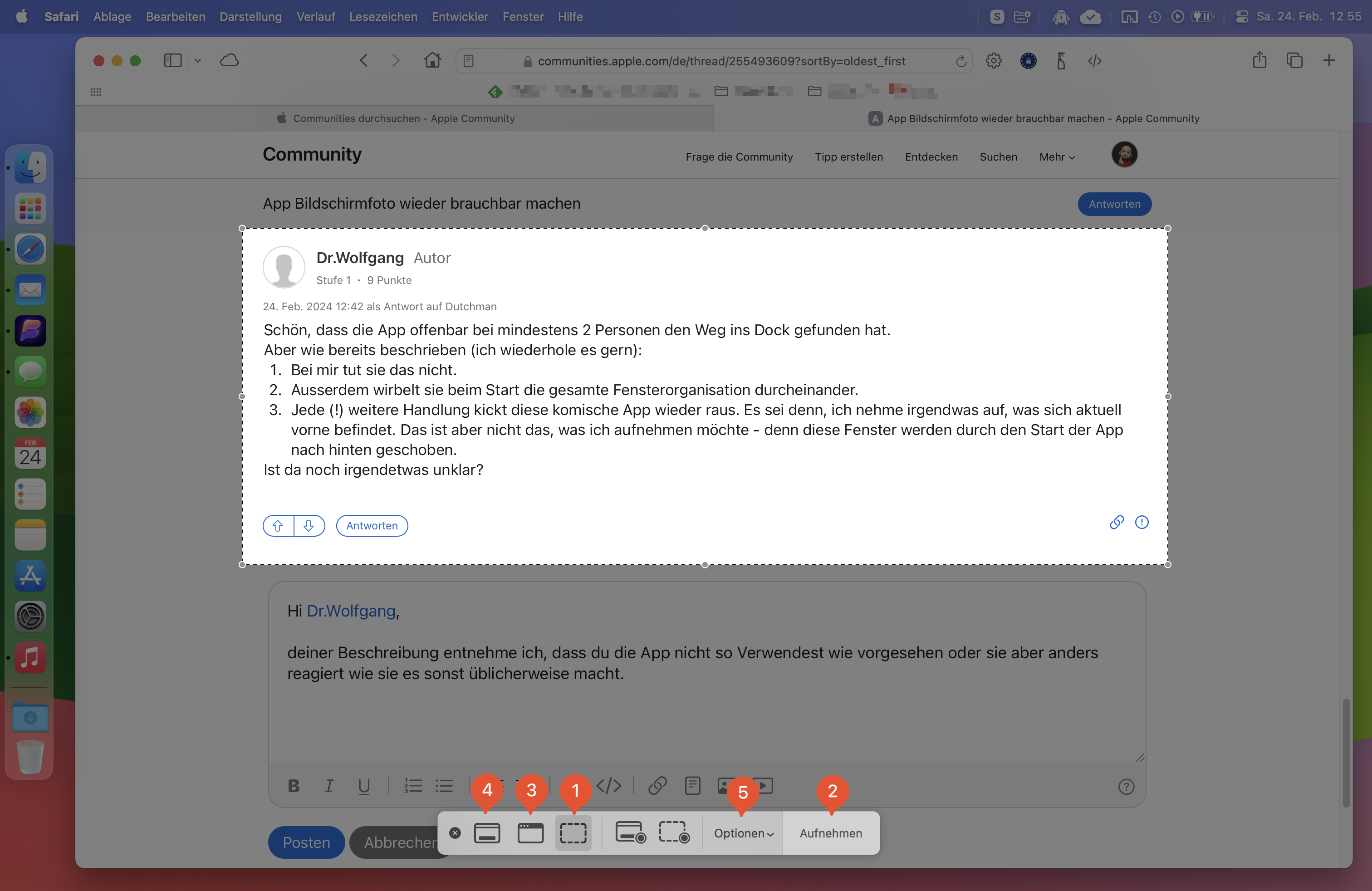 …keine Ahnung, was du da jetzt von uns erwartest. Keiner hat hier einen direkten Draht zu Tim Cook. Und nebenbei bemerkt, auch bei mir liegt die App schön im Dock und das in allen Anwendungen. Ein Tipp drauf und ein kleines funktionales Fenster öffnet sich. Und hier lege ich kurz fest, was ich abfotografieren möchte (den ganzen Bildschirm, einen Ausschnitt, vielleicht ein Bildschirmvideo). Alternativ geht’s, wie Netcracker schon schrieb, über einen Shortcut. Kann man, muss man aber nicht.