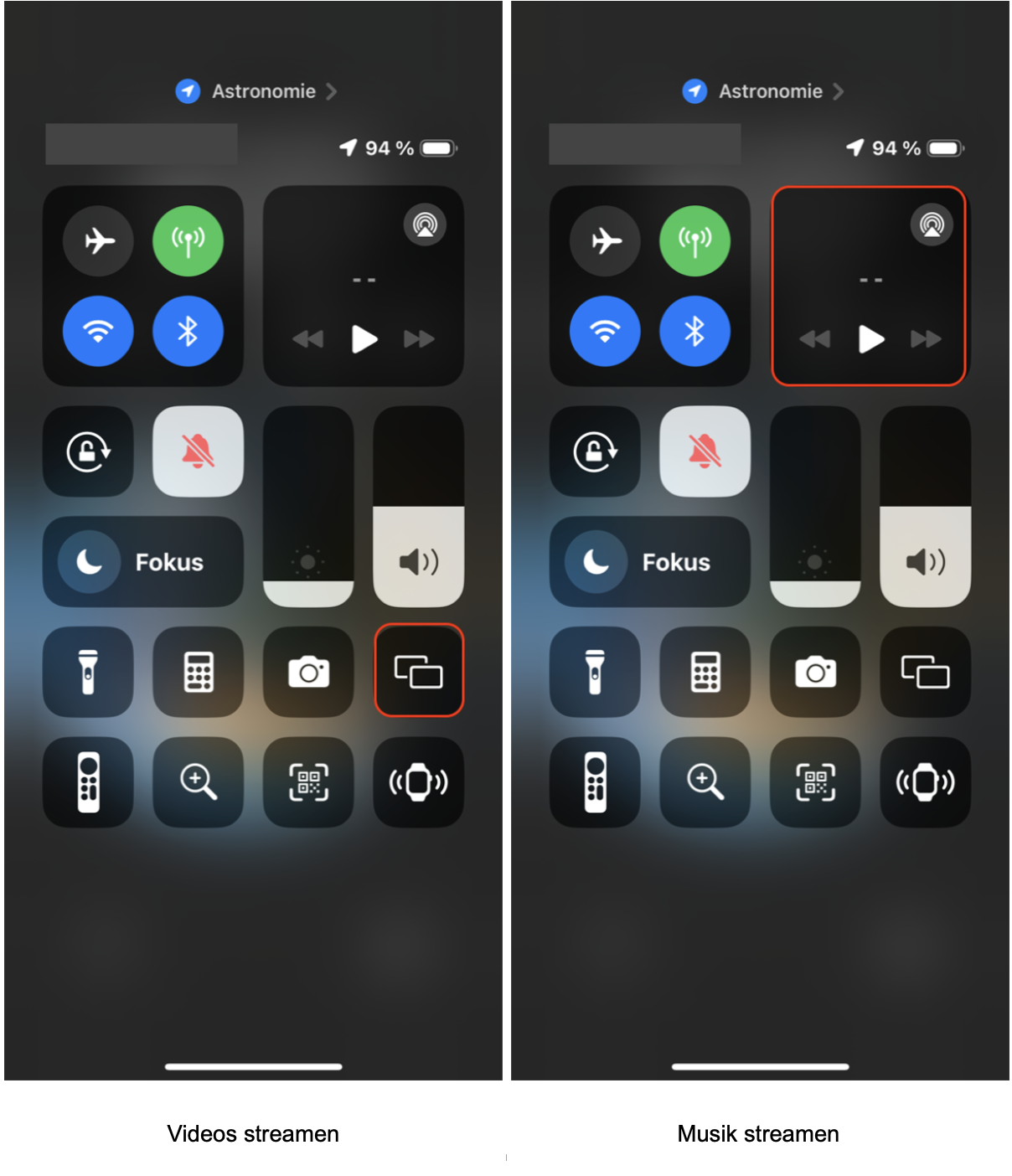 Für das Streamen von Video- und Audiodateien stehen dir diese Möglichkeiten im Kontrollzentrum zur Verfügung.