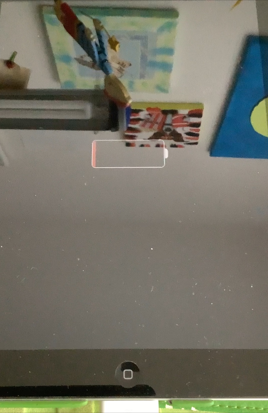 Diese Anzeige der leeren Batterie mit dem restlichen minimalen roten Inhalt weißt darauf hin, dass das iPad geladen werden muss und der gerade angesteckte Anschluss defekt ist. Das iPad startet nicht, weil seine Akkuladung für das Hochfahren nicht ausreicht.