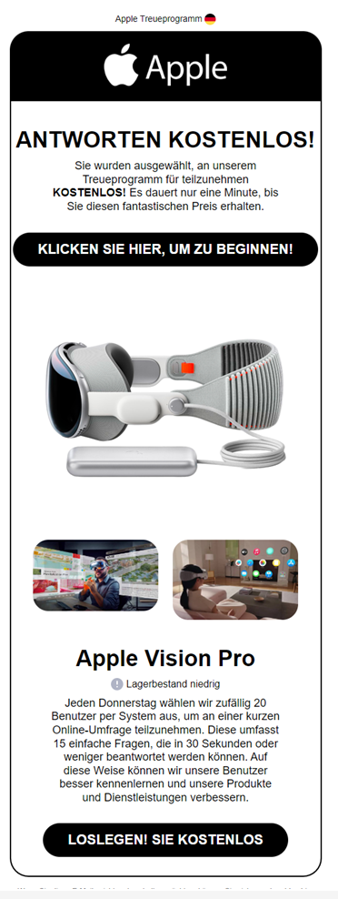 Ich habe ein angebliches "Apple Treueprogamm"-Mail erhalten ausgewählte Apple Shop-User erhalten.