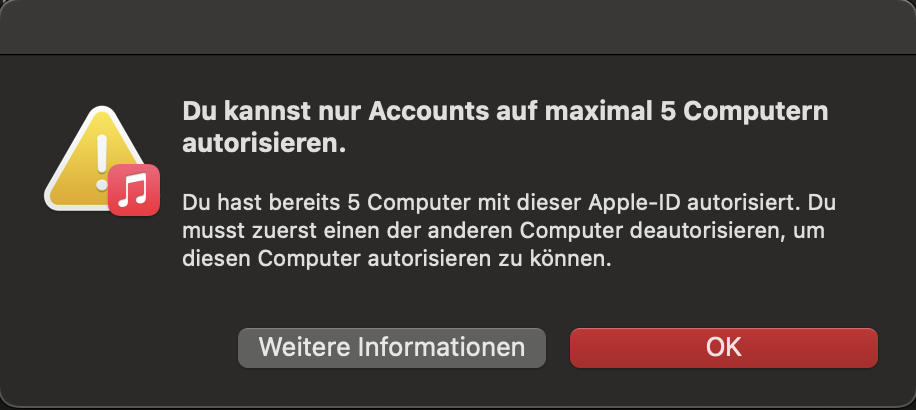 Anders als im Artikel beschrieben, gibt es "Deauthorize all" nicht. Zudem ist laut Accounteinstellungen nur ein Computer registriert. Dennoch kann ich iTunes Match aktuell nicht nutzen, weil weitere Registrierungen (neues MacBook Pro) nicht möglich sind.