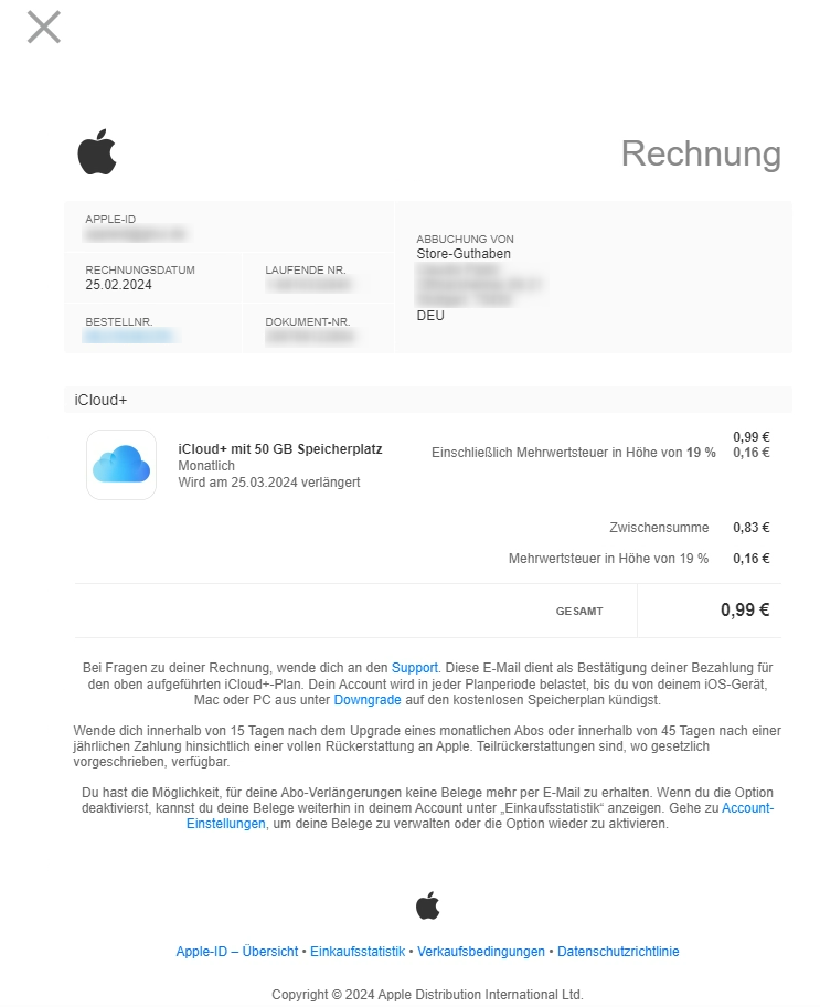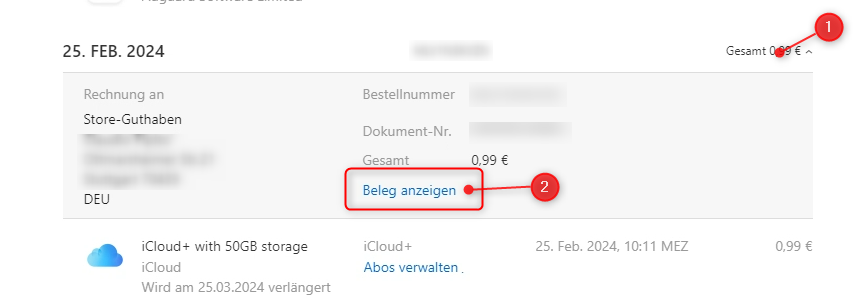 Ich muss nachträglich vom Jahr 2023 Rechnungen für Icloud Nutzung ausdrucken, da ich sie nicht mehr als Mail habe. Achtung ich brauche nicht meine Bestellungen die schnell gefunden habe, sondern alle Rechnungen von 2023. Wer hat so ein Rätsel schon erfolgreich gelöst;-)