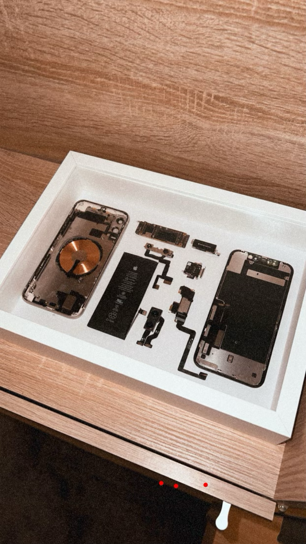 Übrigens, abgesehen vom „Kaufpreis“ des iPhones (habe es damals geschenkt bekommen) hat mich das Projekt nicht mehr als 20€ gekostet. Ein Rahmen bei unserem Lieblings schwedischen Einrichtungshaus der eine entsprechende Tiefe hat, ein kleines Schraubendreher Set mit einem Pentalope Dreher und ein bisschen Dicke Pappe für den Hintergrund. Das hat sich auf jeden Fall gelohnt und steht so immer noch bei mir zuhause rum. Kriegt auch immer wieder interessierte Blicke von Besuchern.