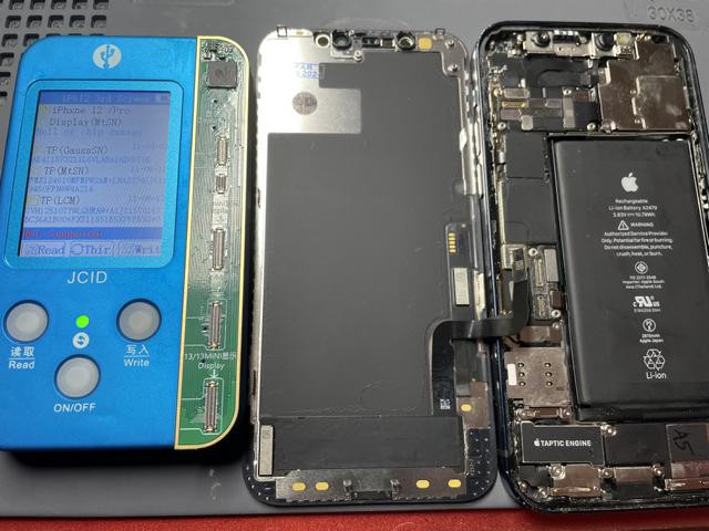 Verbaut war ein Billigteil von Display, das schon durch einen kleinen Sturz komplett ausfiel. Die Displaydaten wurden vom Verkäufer vom Originalteil nicht übernommen, damit ist die Option Truetone Geschichte. Auf das erneuern der Dichtung hat man natürlich auch verzichtet. Das Ergebnis: FaceID und die Frontkamera völlig verstaubt. Die wasserbeständigkeit vom Gerät ist auch gleich null.