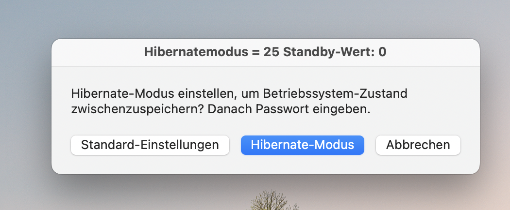 (PS: Die Datei kann zuerst im Applescript-Editor geöffnet werden, um zu schauen, was sie macht. Beim Doppelklicken öffnet sich ein Dialog, mit dem man den Modus 25 einstellen kann oder zur Standardeinstellung zurück kehren kann). Der Hibernatemodus kann sonst nur über das Terminal eingestellt werden, weil es aktuell keine App mehr gibt, um ihn zu aktivieren.