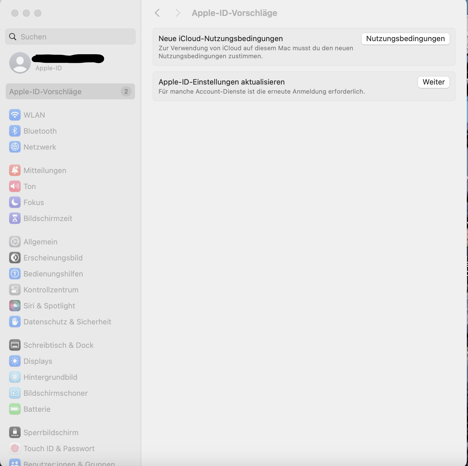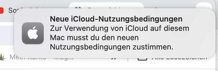 Seit mehreren Tagen bekomme ich die Meldung auf meinem Macbook Air M1, 2020 (mehr Infos kann ich leider nicht geben, weil ich wie gleich erklärt keinen Zugriff auf die Systemsteuerung habe) die Meldung, dass ich den neuen iCloud-Nutzungsbedingungen zustimmen soll. Rechts oben am Bildschirm und wenn ich sie weg klicke, hüpft unten das System-Steuerungssymbol.
