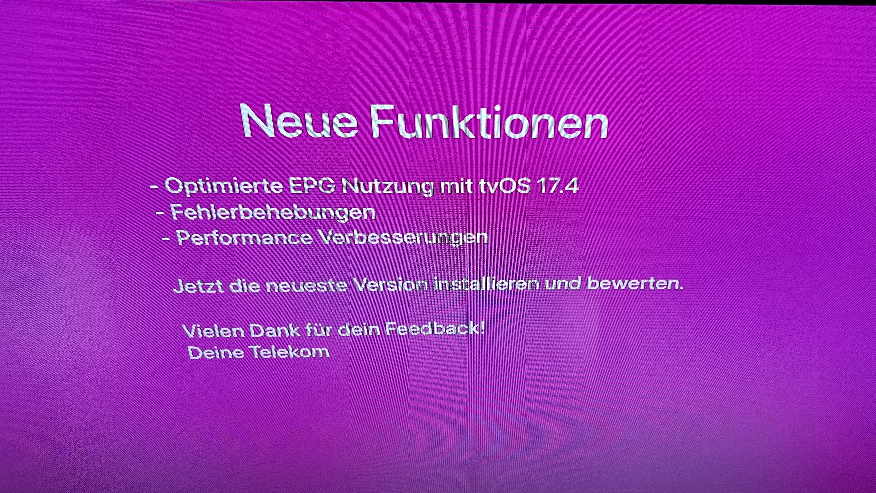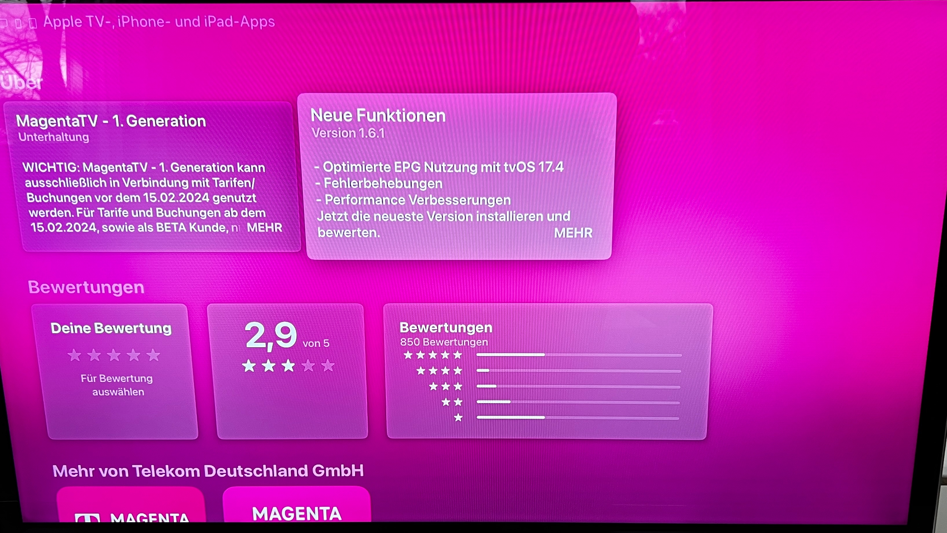 Überprüfe, ob eine Aktualisierung für die Magenta TV App verfügbar ist. Gehe dazu zum App Store auf deinem Apple TV, navigiere zur Magenta TV App und prüfe, ob eine Update-Schaltfläche vorhanden ist.