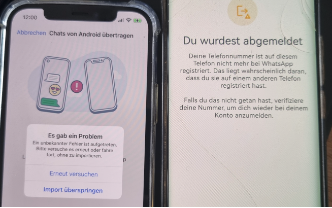 Ja, ich habe schon drei Totallöschungen hinter mir, jetzt beim aktuellen sehe ich im neuen Handy: Chats werden von Android übertragen aber bei 40 % bleibt es hängen und nach einer Weile kommt "Ein unbekannter Fehler ist aufgetreten", siehe Bild: Links das iPhone, rechts das alte Android: